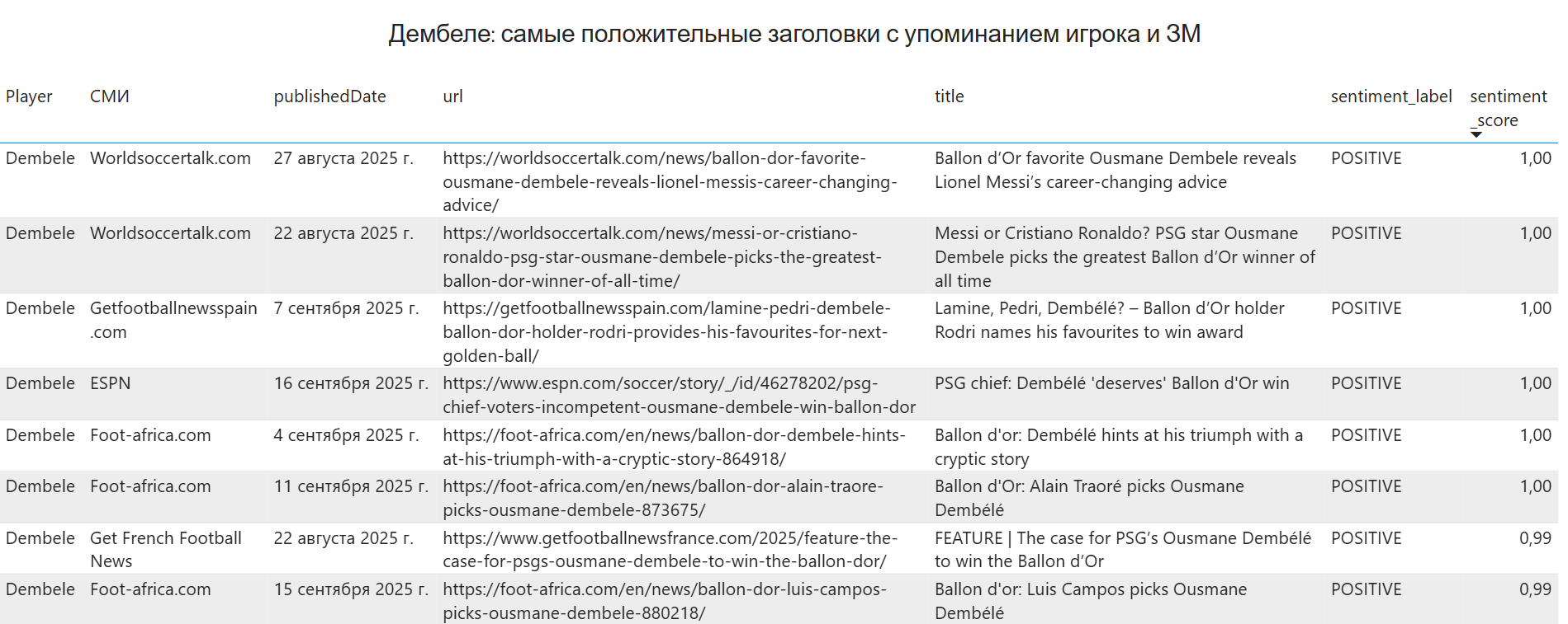 В выборке все статьи на английском языке, которые находились в Google News в период с 20.08.25 по 20.09.25 с упоминаниями в теле или заголовке статьи фамилии одного из претендентов на Золотой Мяч (для поиска статей с Мбаппе и Дембеле использовалось два варианта написания – Dembélé/Dembele и Mbappé/Mbappe). Для исключения предвзятости из выборки были удалены статьи тех СМИ, у которых в названиях присутствуют футбольные клубы.