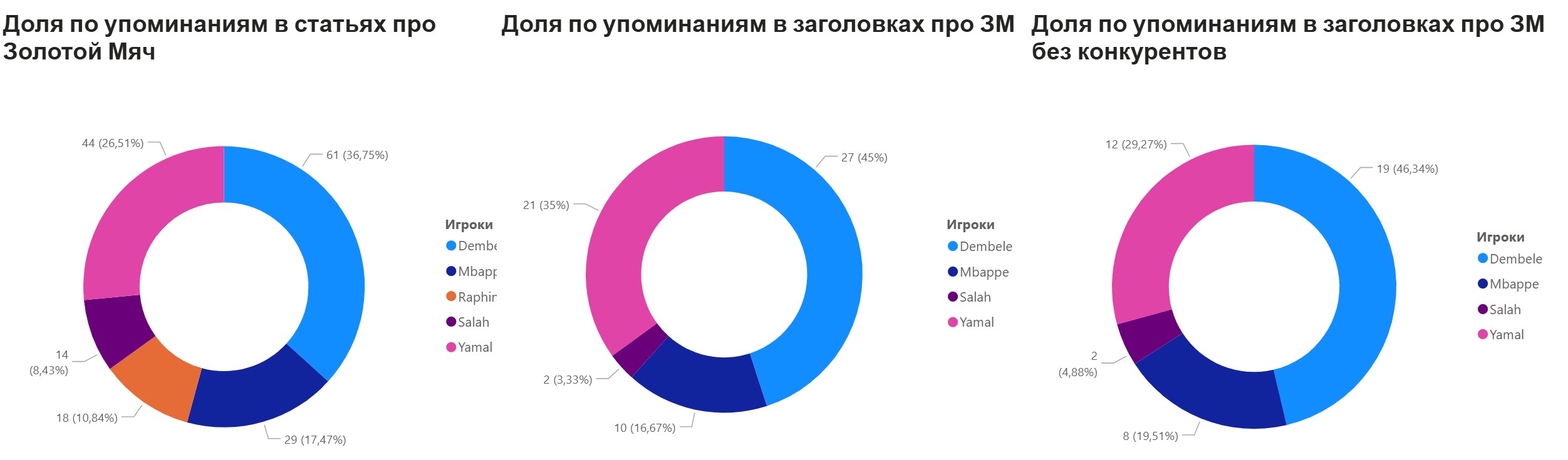 Таким образом получаем, что среди всех статей о «Золотом мяче» на Дембеле приходится наибольшая доля упоминаний (36,75%), далее следуют Ямаль (26,51%), Мбаппе (17,47%). Если считать количество статей в заголовках которых написано и про «Золотой мяч» и про игрока, то лидирует также Дембеле – 45%, следом Ямаль – 35%, у Мбаппе только 10%, а у Рафиньи нет упоминаний.