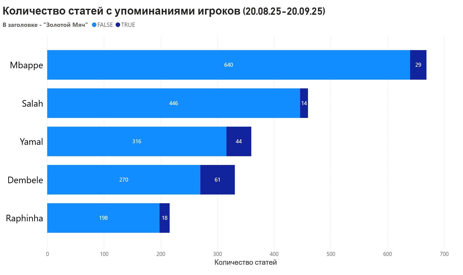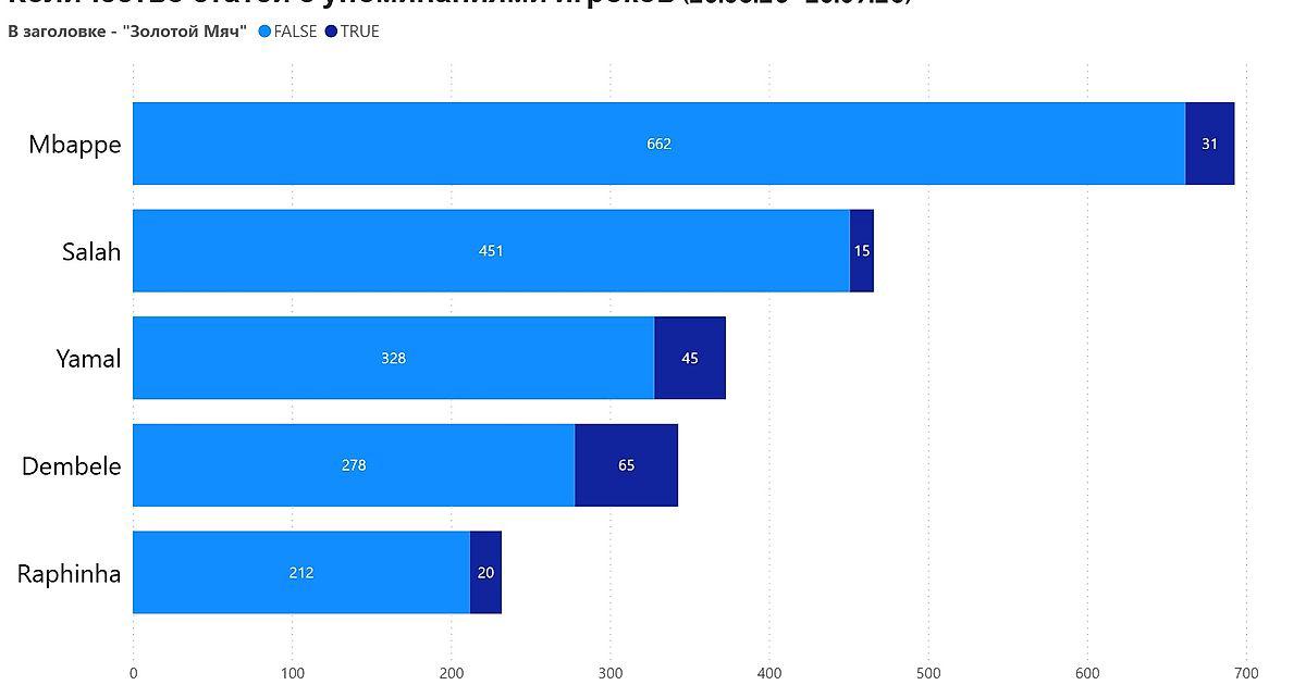 По общему количеству статей, содержащих упоминание игрока лидирует Килиан Мбаппе (669 статьи). Анализ статей, в заголовке которых прямо упоминается «Золотой мяч», показывает иную картину: Усаман Дембеле: 61 статья; Ламин Ямаль: 44 статей; Килиан Мбаппе: 29 статей; Рафинья: 18 статей; Мохамед Салах: 15 статей.