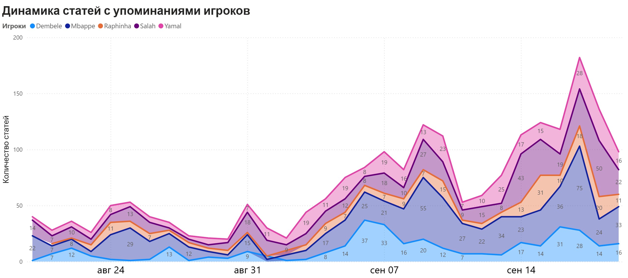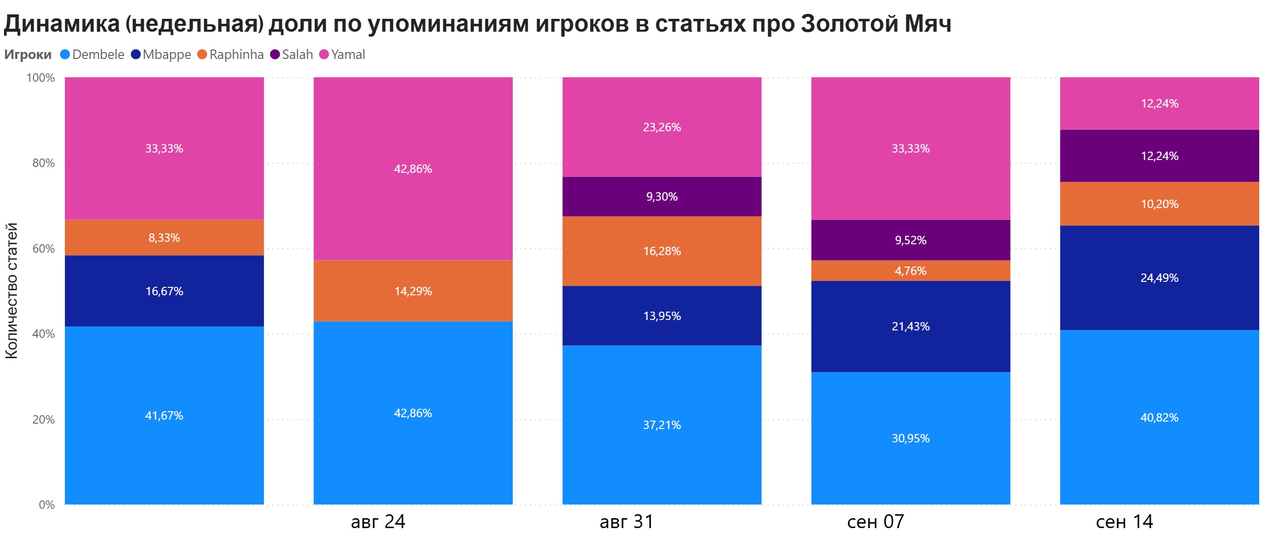 За последнюю неделю исследуемого периода наблюдается заметный рост медиаактивности вокруг Мбаппе в контексте награды, в то время как доля обсуждения Ямаля заметно снизилась. Активное обсуждение кандидатуры Салаха началось лишь в последние недели. А у Дембеле стабильно высокая доля, только на позапрошлой недели уступал Ямалю.