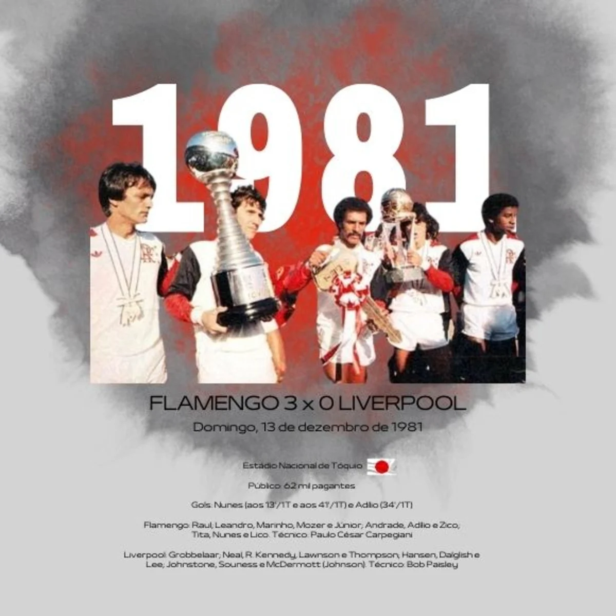 Двумя годами ранее Япония была взбудоражена подвигами Диего Марадоны, юной сенсации, которая привела Аргентину к победе на молодежном чемпионате мира. Успех этого турнира побудил к трансформации Межконтинентального кубка. Раньше он проводился в два матча в Южной Америке и Европе — формат, который вызывал бесконечные логистические проблемы и опасения по поводу безопасности перед фанатичной толпой — японский производитель автомобилей Toyota взял на себя спонсорские обязанности в 1980 году с условием, что розыгрыш будет сведен к одному матчу в Токио. В первом издании нового формата Ноттингем Форест Брайана Клафа отправился в Азию, где был побежден со счетом 1:0 Насьональ перед 62 000 зрителей. Предприятие оказалось успешным, и японские болельщики сформировали прочную связь с южноамериканской игрой. А в декабре следующего года, Национальный стадион снова был заполнен до отказа, чтобы приветствовать двух гигантов мировой игры. Перед самой игрой, которая началась в полдень холодного зимнего воскресенья 13 декабря, Фламенго провели свой обычный ритуал, исполнив несколько мелодий самбы, прежде чем сбиться в кучу в туннеле. «Каждый из нас что-то говорил [и] мы молились», — вспоминает Андраде. «[Игроки Ливерпуля] посчитали это странным и начали смеяться над нами. Жуниор использовал это, чтобы мотивировать группу. Он сказал: «Смотрите, они смеются. Когда мы выйдем на поле, давайте покажем им, кто мы».