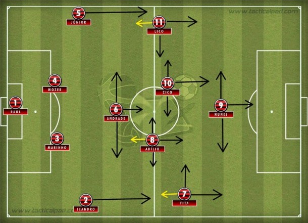 Лишившись после Сантьяго двух травмированных игроков, Лико и Фигейреду, Карпеджани постарался не только компенсировать потери, но и нейтрализовать контратакующий потенциал Кобрелоа. Вместо тривиальной замены одного вингера (Лико) на другого, тренер предпочел усилить опорную зону сразу двумя знатными мастерами по отбору: Андраде и Леандро, переведенного с позиции правого защитника. Вместо него на фланг защиты вышел Ней Диаш. Леандро же провел великолепный матч в качестве опорного хавбека: его надежность в игре дала Андраде больше свободы в атаке, а крайним защитникам - возможность чаще идти вперед без опасений за свои тылы. Когда же Андраде по ходу матча был удален, Леандро фактически с одинаковым успехом сыграл за двоих. Исключительная работоспособность и мобильность позволили Адилио при необходимости как играть в полузащите, так и компенсировать отсутствие Лико на левом фланге атаки. Зико же периодически создавал с Нунесом сдвоенный центр, так что временами оборона Кобрелоа имела против себя фактически четырех нападающих (4-2-4), в то время как чилийский хавбек Хименес, призванный попытаться нейтрализовать бразильскую Десятку, оказывался в печали в поисках своего оппонента.