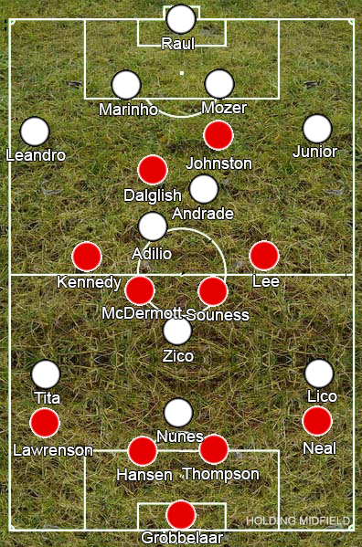 А вскоре англичанам, явно в этот день не блиставшим умением завершать атаки, удалось и вовсе невиданное в этом матче: Макдермотт ухитрился попасть в створ с острого угла, с хорошими шансами на успех, но голкипер Рауль демонстрирует прекрасную реакцию. Расплата за дерзость не преминула себя долго ждать. За четыре минуты до перерыва Зико безупречным пасом еще раз вскрыл оборону Ливерпуля. Нунес снова оказался на на острие атаки и, выскочив один на один с Гроббеларом, пробил безупречно в дальний угол, 3-0!!!
