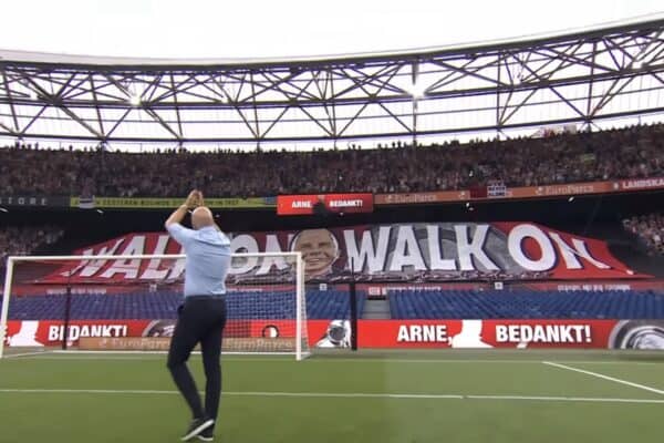 Во время последнего матча Слота болельщики «Фейеноорда» вывесили баннер с надписью «Иди, иди» — отсылка к знаменитому гимну «Ливерпуля». Почти одновременно в другом портовом городе, расположенном в 500 км к западу, Юрген Клопп призвал толпу скандировать имя своего преемника: под мелодию песни Opus «Live is Life» — одну из песен, которую зрители «Энфилда» адаптировали для немца, — на трибунах зазвучало «Арне Слот».