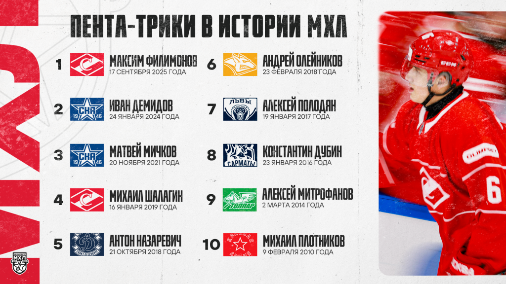 В тот же знаменательный для Дениса Владиславовича вечер свой рекорд поставил нападающий молодежного «Спартака» и один из лучших снайперов прошлого сезона МХЛ Максим Филимонов. Форвард забросил в ворота «Красной Машины-Юниор» пять шайб!