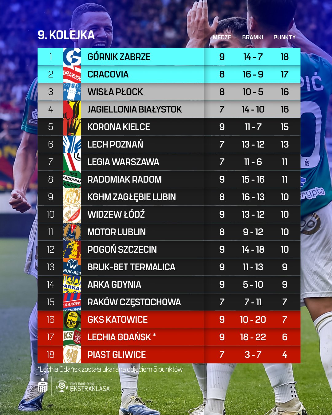 Девятый тур Экстракласы принес нам смену лидера. В Щецине и Забже команды порадовали болельщиков большим количеством забитых мячей, а центральный матч тура между «Ракувом» и «Легией» не обошелся без споров вокруг работы арбитра.