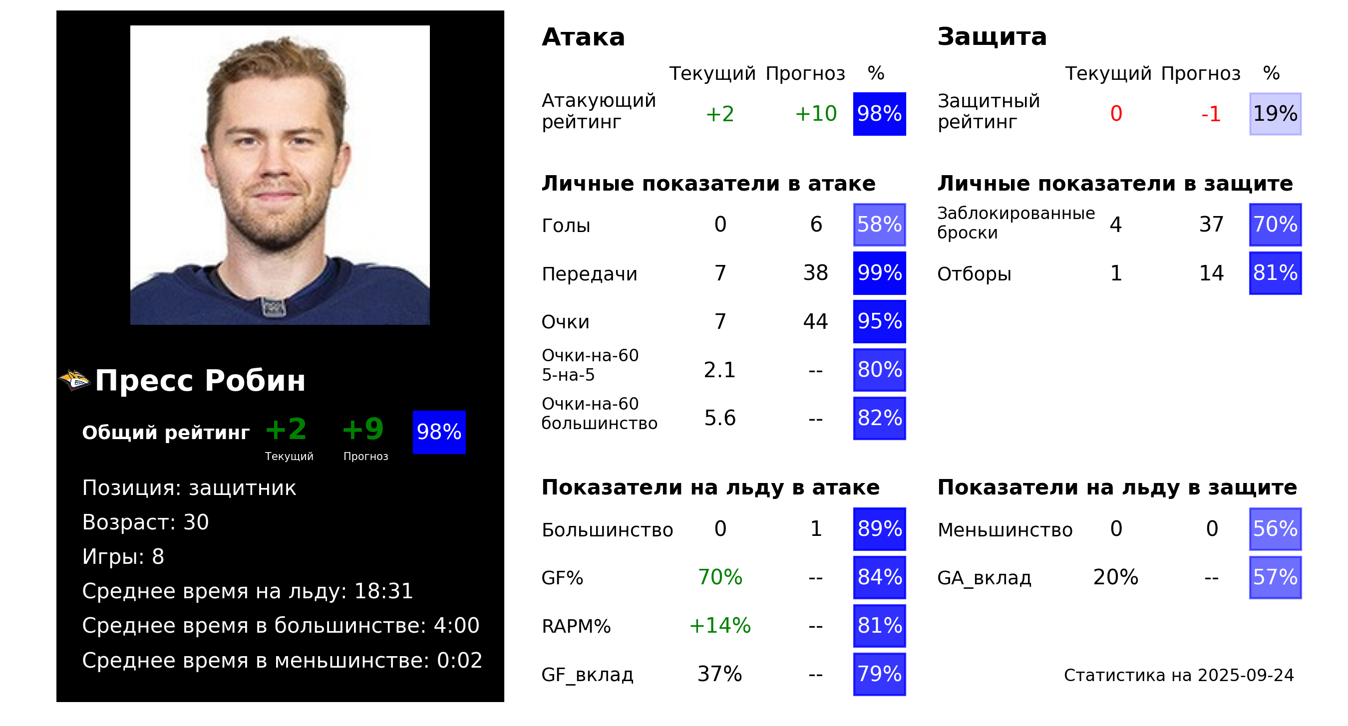 Атака Авангарда во главе с Потуральски, Прохоркиным и Окуловым (все трое в топ-8 по общему рейтингу) обеспечила омичам лучший атакующий рейтинг в лиге и место в топ-6 по основным командным метрикам, включая первое место по заброшенным шайбам в равных составах. Единственным тревожным сигналом остается слегка завышенный показатель PDO – 103,6%. На дистанции сезона он редко превышает 102%, что может указывать на вероятность небольшой регрессии.