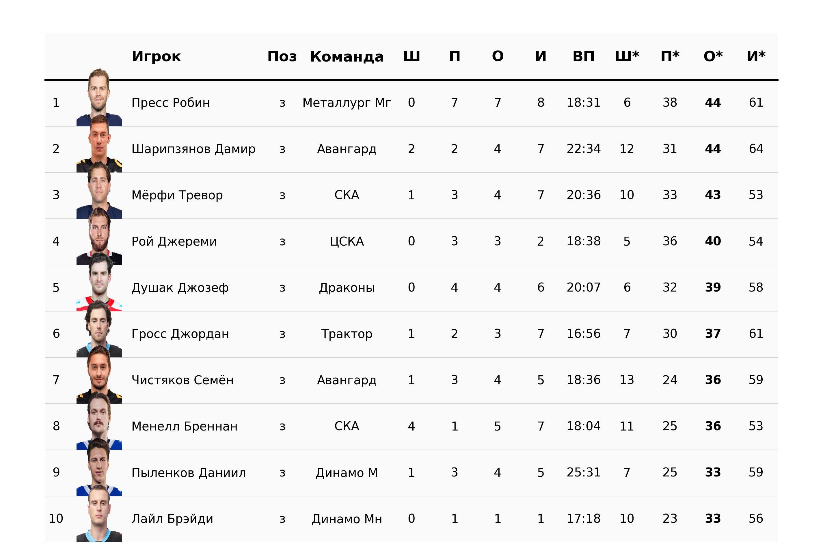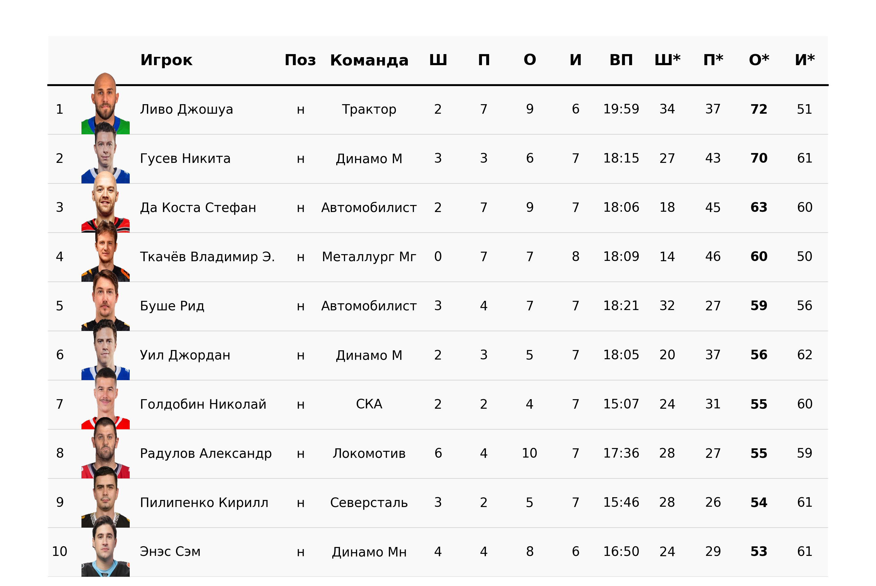 В фаворитах бомбардирской гонки пока все ожидаемые персонажи: Джошуа Ливо отлично начал сезон в Тракторе и отрабатывает выданные авансы, а Никита Гусев хоть и не так ярко провел старт сезона, все еще прогнозируется сразу за спиной звездного канадца. Рид Буше в свою очередь должен побороться за снайперский титул, а Владимир Ткачев за звание лучшего ассистента.