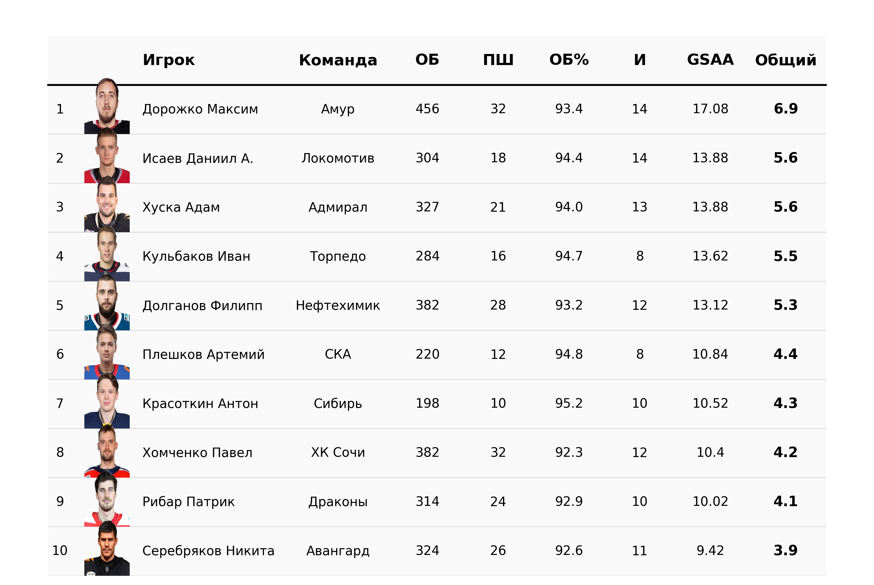 Максим Дорожко, лидер по рейтингу и GSAA, продолжает давать шансы Амуру, который при 17-й разнице бросков (-24) находится на 11-м месте по разнице шайб (-1).