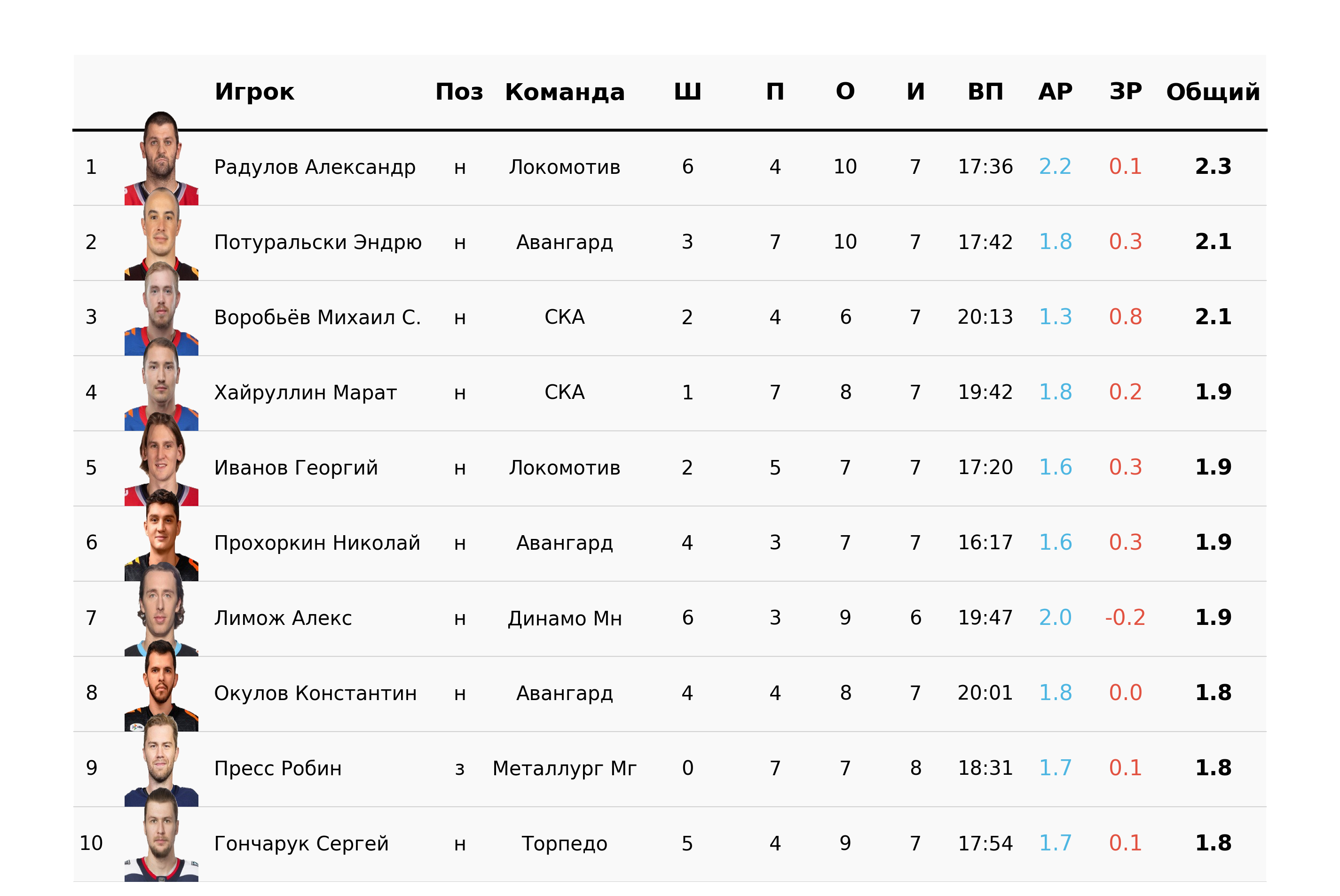 1. «Локомотив» (Ярославль) 7 игр, 5-1-1 +8 (Общий рейтинг +11,8)