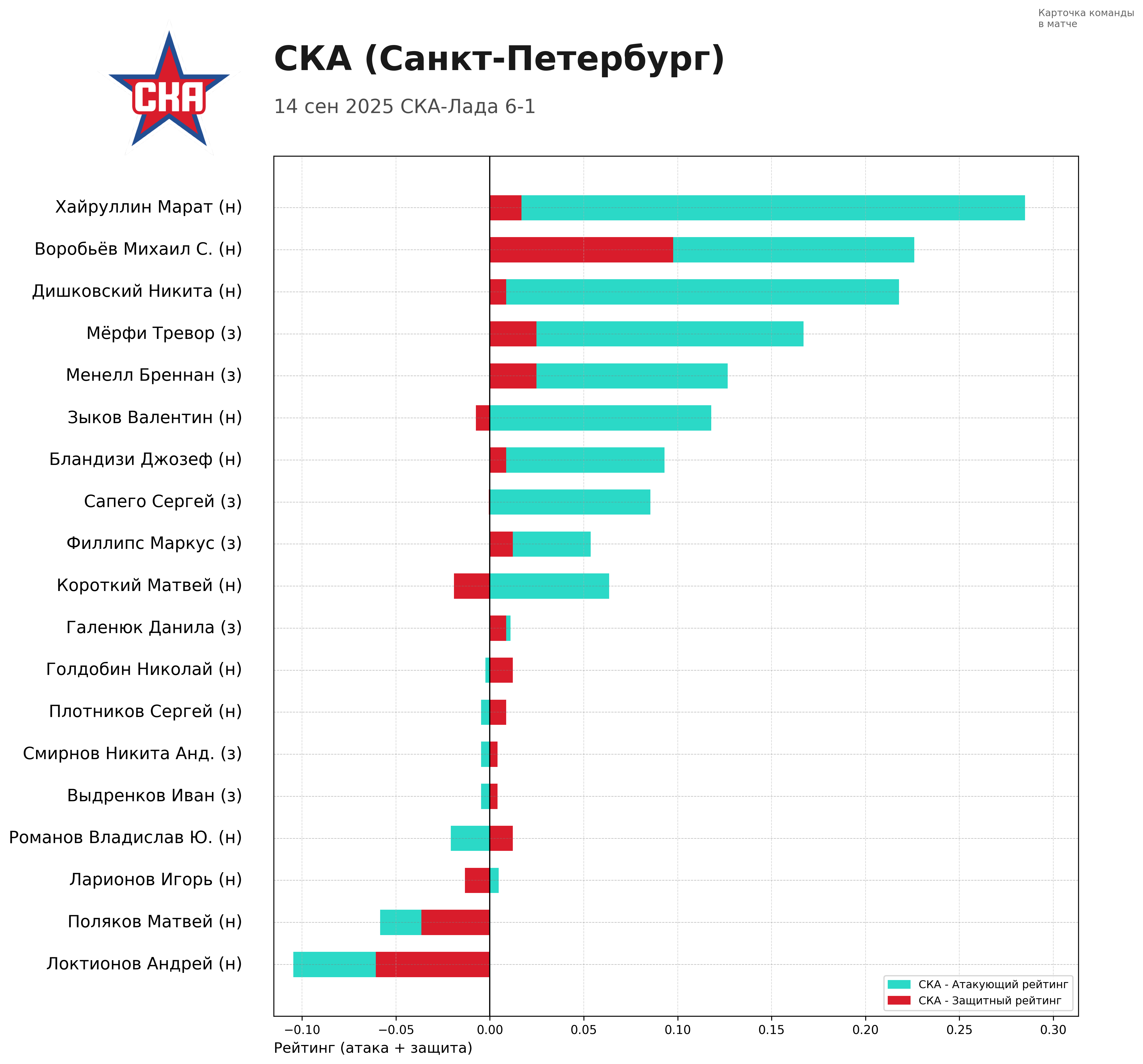 После двух обидных поражений на старте сезона СКА одержал 4 победы подряд и несмотря на обидное поражение от Авангарда в топ-5 по заброшенным шайбам и разнице шайб. Михаил Воробьев выглядит не только как первый центр команды, но и как один из лучших двусторонних центров КХЛ, имея лучший оборонительный рейтинг среди всех нападающих. В матче с Ладой, например, его вклад в обороне превысил вклад всей остальной команды вместе взятой.