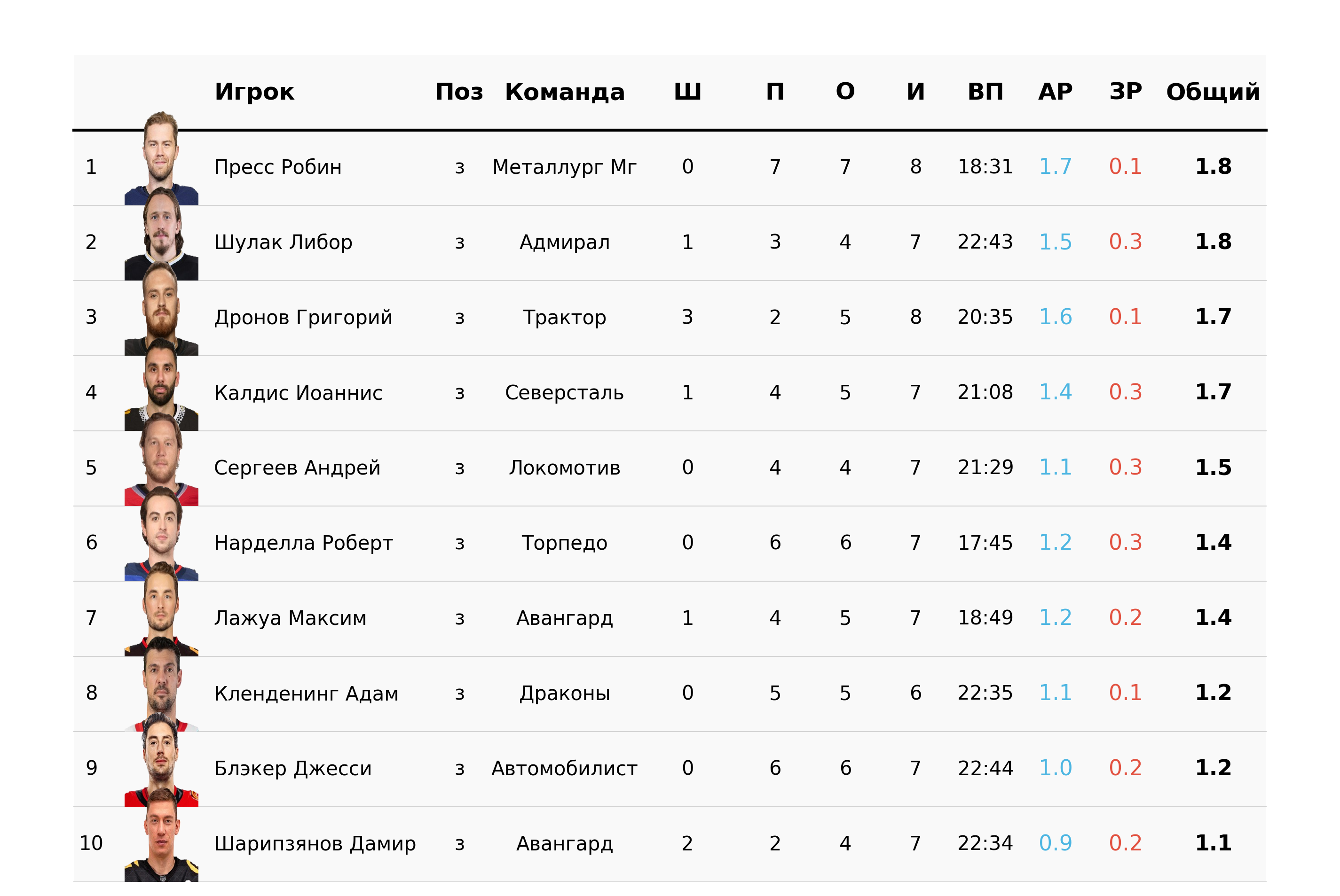 Топ-3 по рейтингу закрывают знакомые имена. Григорий Дронов (Трактор) совмещает как большой объем работы в защите, являясь лучшим в лиге по заблокированным броскам, так и активное участие в атаке – топ-3 по броскам, заброшенным шайбам и голам команды с ним на льду. Либор Шулак все также остается незаменимой частью механизма Адмирала: лучший в команде по вкладу GF (75% голов команды с ним на льду), лидер в лиге по броскам в створ во всех ситуациях и 5-на-5.