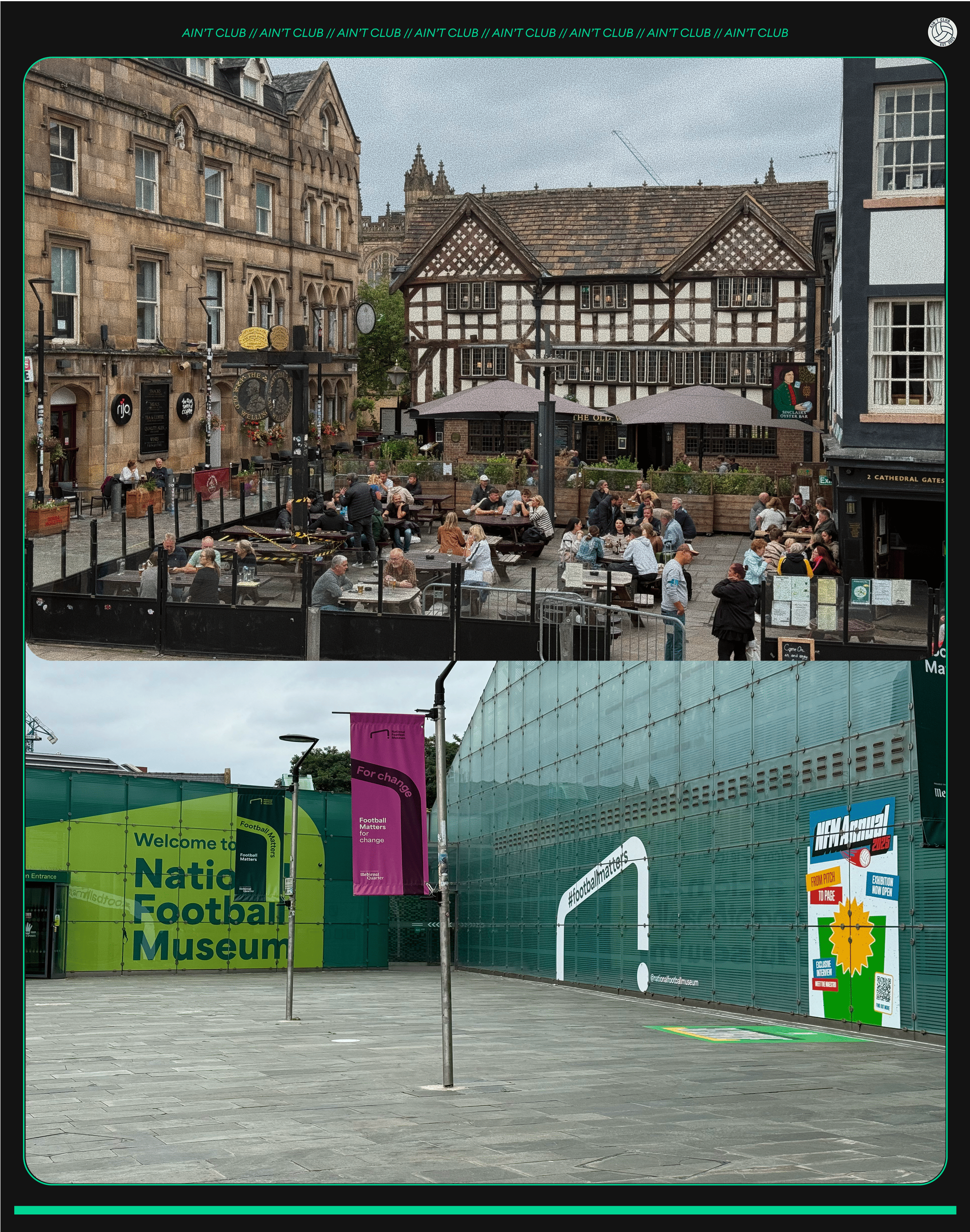 Всего в нескольких минутах ходьбы расположен Национальный музей футбола – место, где каждый читатель «Спортса» наверняка застрял бы на пару дней. Нам не повезло – пришлось оставить его на будущее. А ведь именно здесь хранится первый Кубок Англии, легендарные реликвии со стадионов мира, интерактивные экспозиции, джерси и фанатские артефакты. В каком-то смысле, музей – это настоящая Мекка футбольной истории.