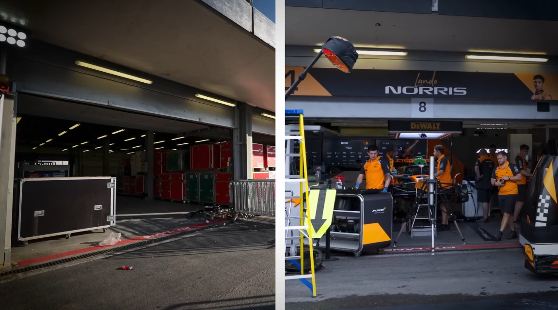 Все вывески над гаражами сняли, и только несколько из них были открыты. Например, здесь стоял болид Ландо Норриса.