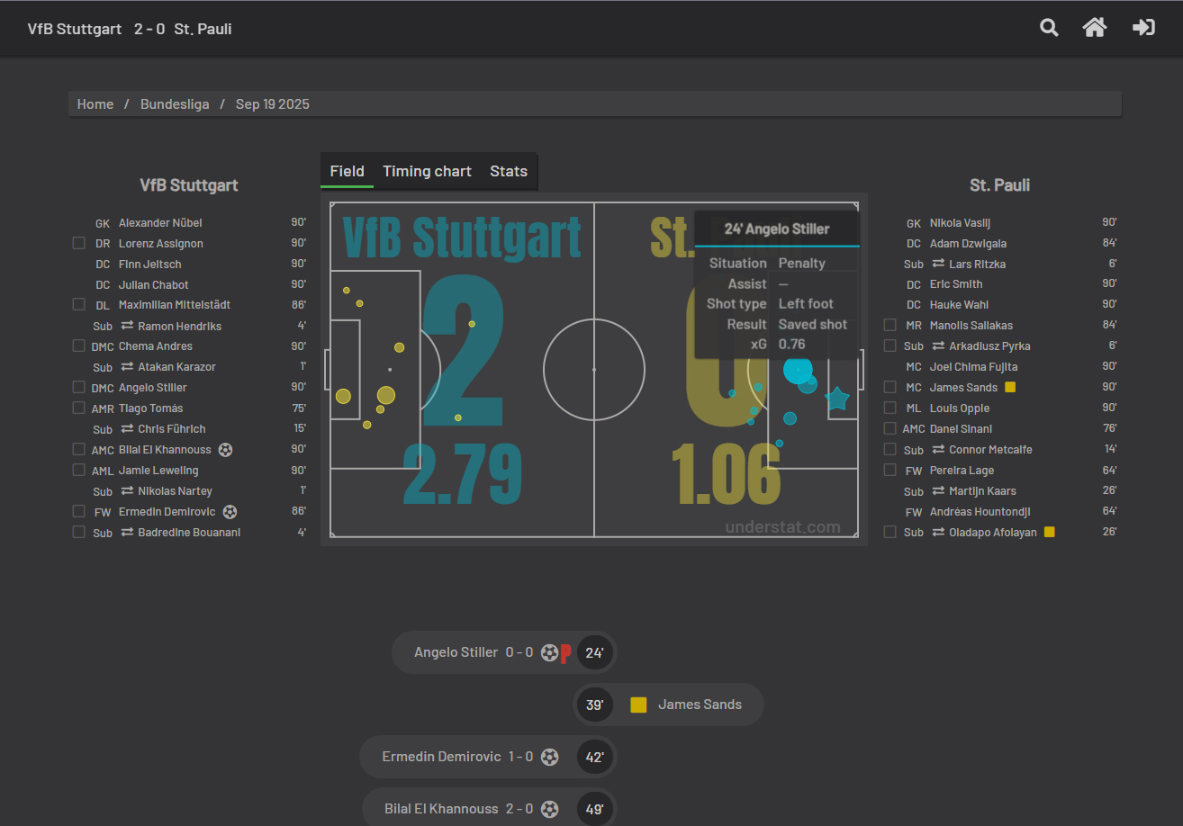 xG (Expected Goals) — это статистический показатель, который оценивает вероятность того, что данный удар станет голом. Ему присваивается значение от 0 до 1. Например, xG=0.1 означает 10% вероятность гола, а xG=0.9 — 90%. Например, пенальти оценивается в xG≈0.76.