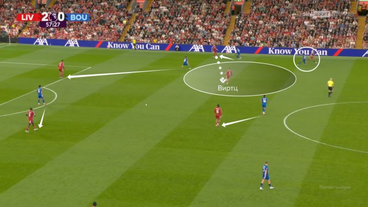 Подобные маневры Флориана еще и помогают преодолевать прессинг. Так Мак Аллистер на рывке выбрался на чужую половину после смещения Виртца на фланг.