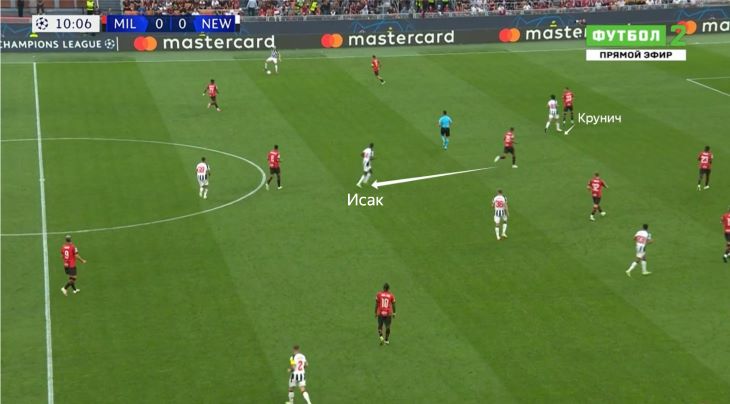 В «Ньюкасле» Исак регулярно отвлекал внимание и создавал пространство для партнеров. Против «Милана» в ЛЧ выдернул Малика Тиава, а ему за спину рванул Сандро Тонали. Раде Круничу пришлось оставить опорную зону и опуститься в оборону.
