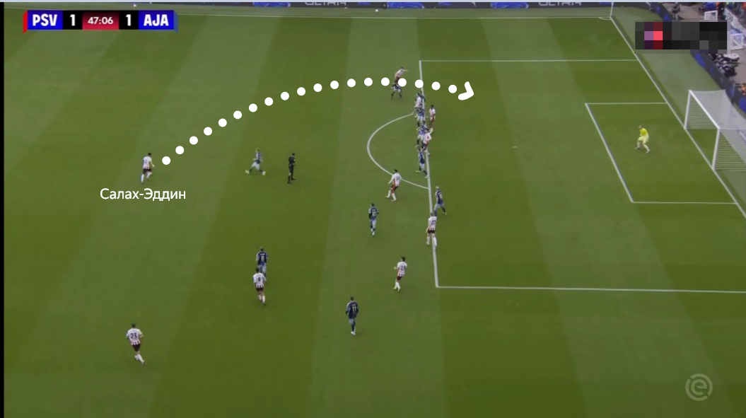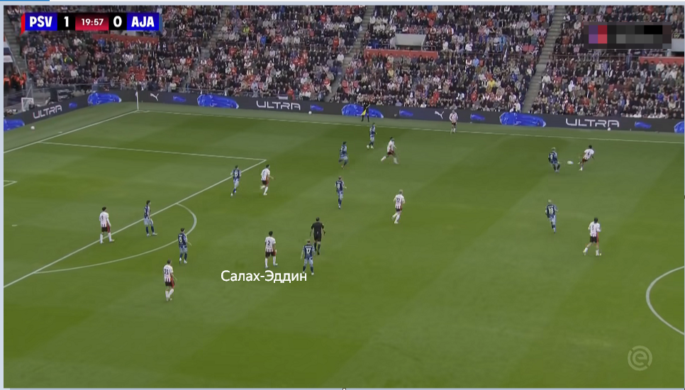 Салах-Эддин на регулярной основе смещался в центральную зону при розыгрыше мяча. Крайний защитник не просто присутствовал на месте опорника и не использовался в целях манипуляции персональным прессингом соперника. Новичок ПСВ был частым адресатом в развитии атак. Защитники Гасьоровски и Фламинго активно пасовали на «непрофильного» опорника. Только Джоуи Верман (буквально глава ЦУП ПСВ на поле) и Серджиньо Дест чаще, чем Салах-Эддин, отдавали продвигающие передачи вперед.