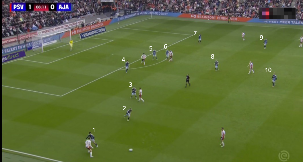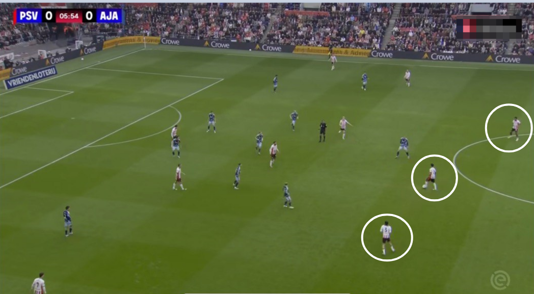 Вместо него вышел мобильный Каспер Дольберг. С ним и быстрым атомным Эдвардсоном на поле у «Аякса» был вариант выбегать в быстрые атаки в случае перехватов или отборов. ПСВ со своей сверхатакующей структурой (3+7), где семь игроков находились в атакующей линии и три защитника оставались у центральной линии, потенциально подставлялся под такие кинжальные атаки соперника.