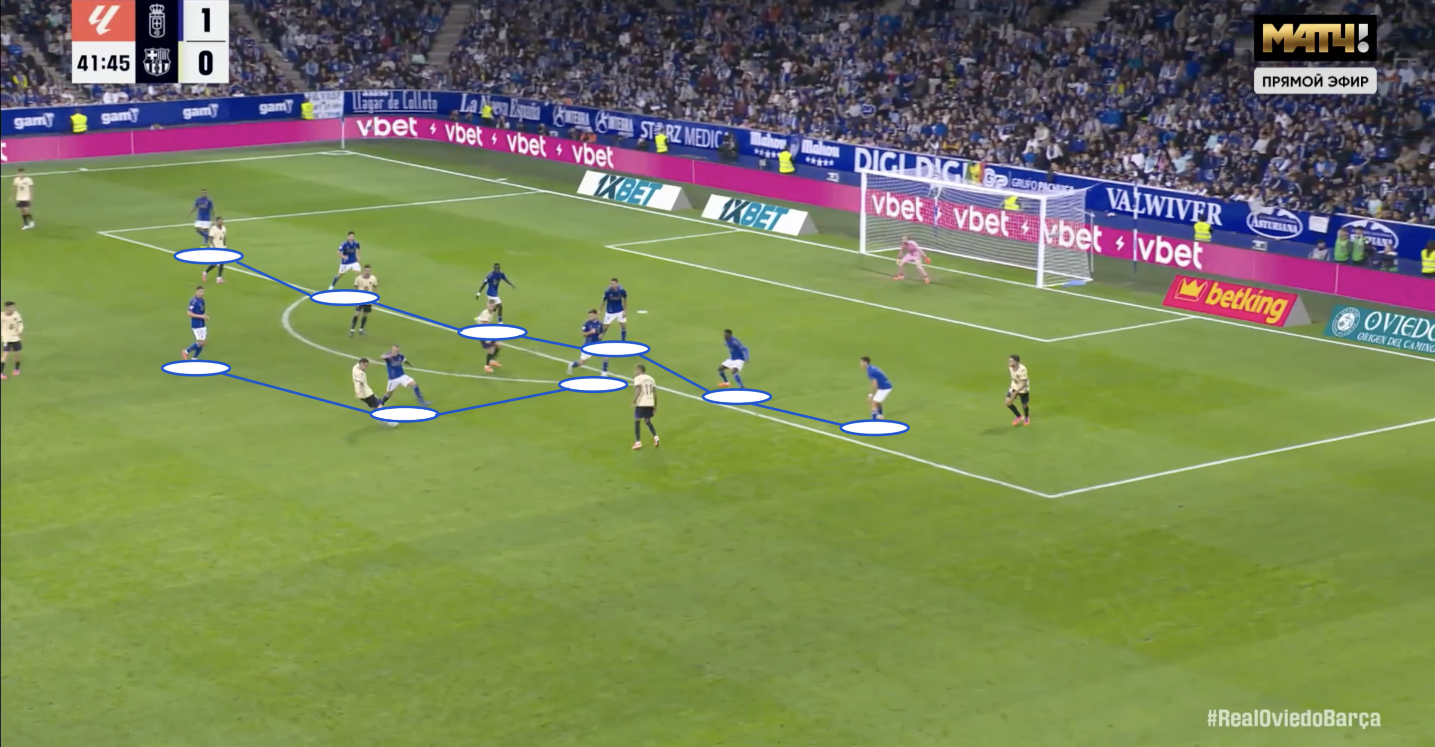 При низком блоке соперника в фазе атаки через центр мяч было трудно продвигать, встречали со спины, не давая развернуться лицом к воротам. Если мяч доводили до их опорной зоны, оборона «Овьедо» успевала выстроить стену, не давая пробить, либо блокировала удар.