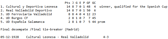 Там, в Мадриде, 5 декабря 1928 года, «Культураль Леонеса» и «Реал Вальядолид» разыграли титул чемпиона региона. В очень напряженном поединке победу со счетом 4:3 одержала команда из Леона. Однако комментаторы из Вальядолида отмечали, что «Пусела» «заслужила победу», признавая высокое мастерство и упорство своих футболистов.