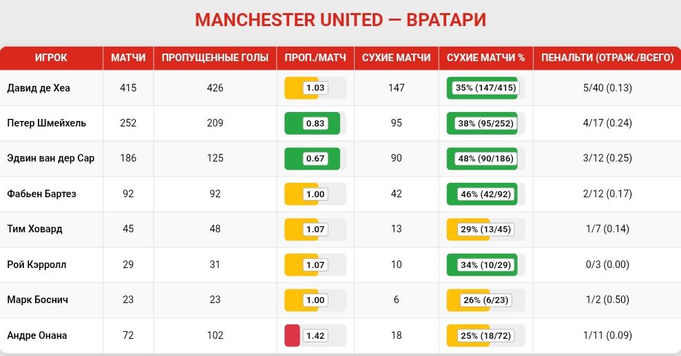 Мы решили вспомнить и слегка проанализировать всех основных вратарей МЮ эпохи АПЛ. В наш список попали только вратари, проведшие наибольшее количество матчей в сезоне за основную команду. Поэтому в этот список не попал Серхио Ромеро, который был превосходным кубковым вратарем, но попал Рой Кэролл, благодаря играм в основе в сезоне до прихода Давида де Хеа. Единственный вратарь из списка, который играл один сезон до появления Премьер-Лиги - Петер Шмейхель. Этот сезон мы благоразумно исключили.