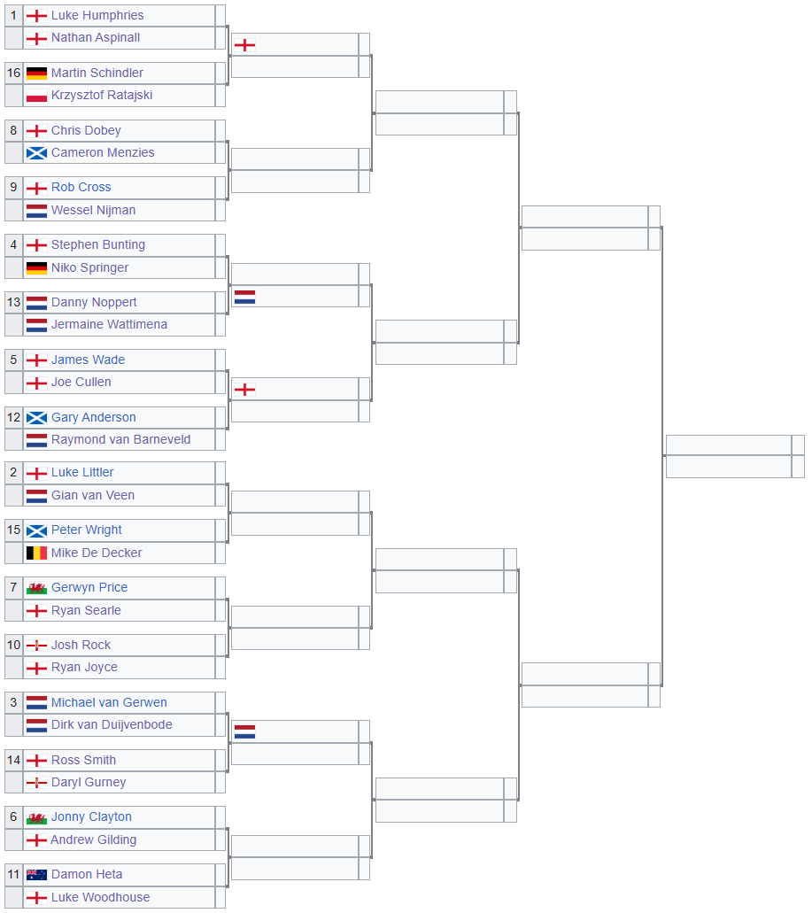 Среди «темных лошадок» предстоящего турнира нужно учитывать формат турнира «double in - double out», а значит, больше шансов появляется у людей, имеющих лучший, чем у соперников, процент закрытых удвоений. В этом смысле определенно можно отметить несколько человек, и прежде всего Гиана ван Вина. Молодой представитель Нидерландов в этом году имеет средний набор 97,77 (6-е место в мире), но его главным игровым преимуществом являются процент закрытий - невероятные 46,58%! Это на два процента лучше, чем у ближайшего преследователя. Однако ему очень сильно не повезло с жеребьевкой и первым матчем, поскольку его ожидает действующий чемпион мира Люк Литтлер. Ближайшим преследователем ван Вина является Дэймон Хета с показателем 44,28%, кроме него, отличный процент закрытых удвоений можно отметить у Гэри Андерсона (42,34%), Росса Смита (42,18%) и Роба Кросса (41,77%).