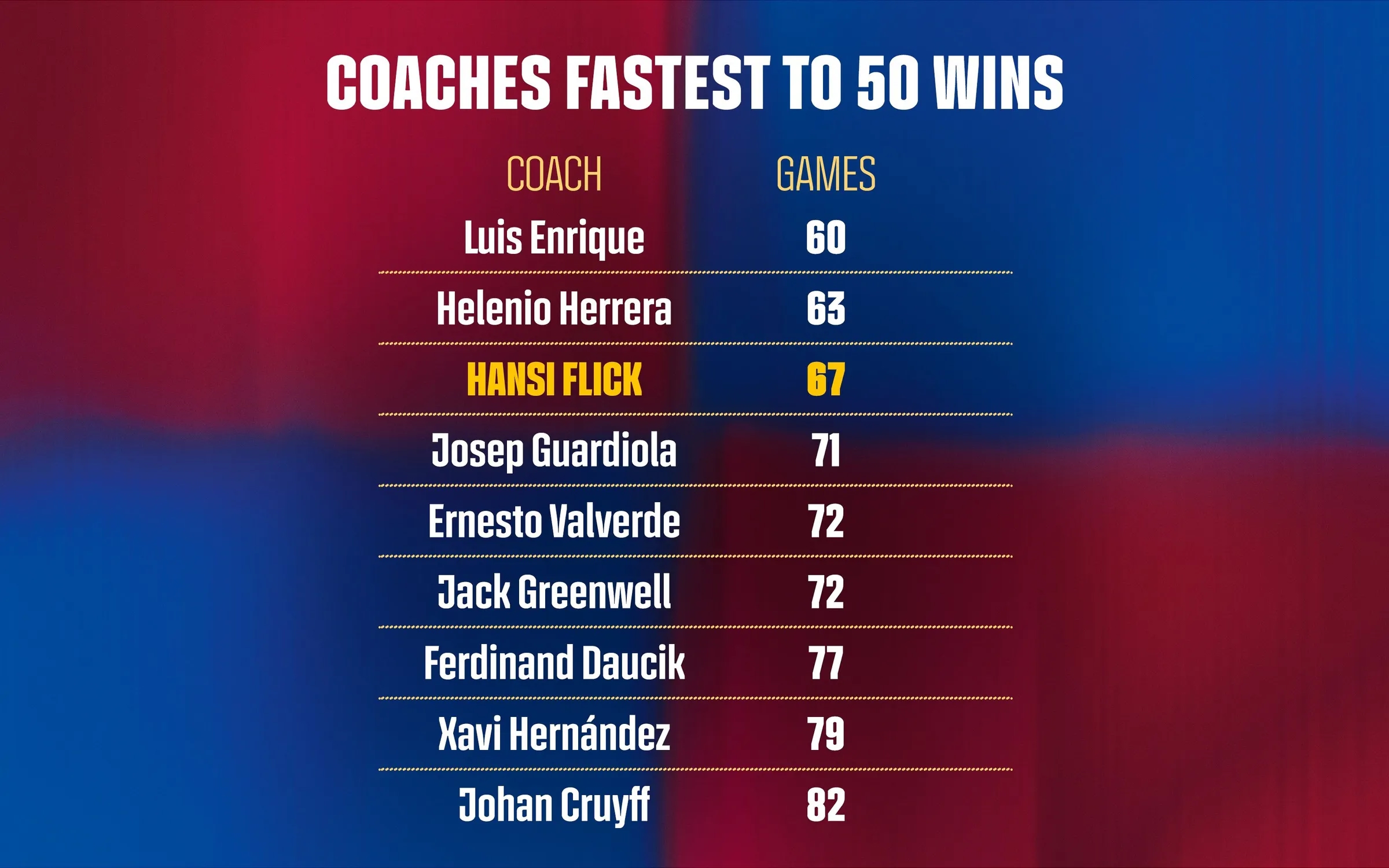 Быстрее Флика 50 побед в «блаугране» набирали лишь двое: Эленио Эррера за 63 игры в 1959-м и Луис Энрике за 60 матчей в 2015-м.