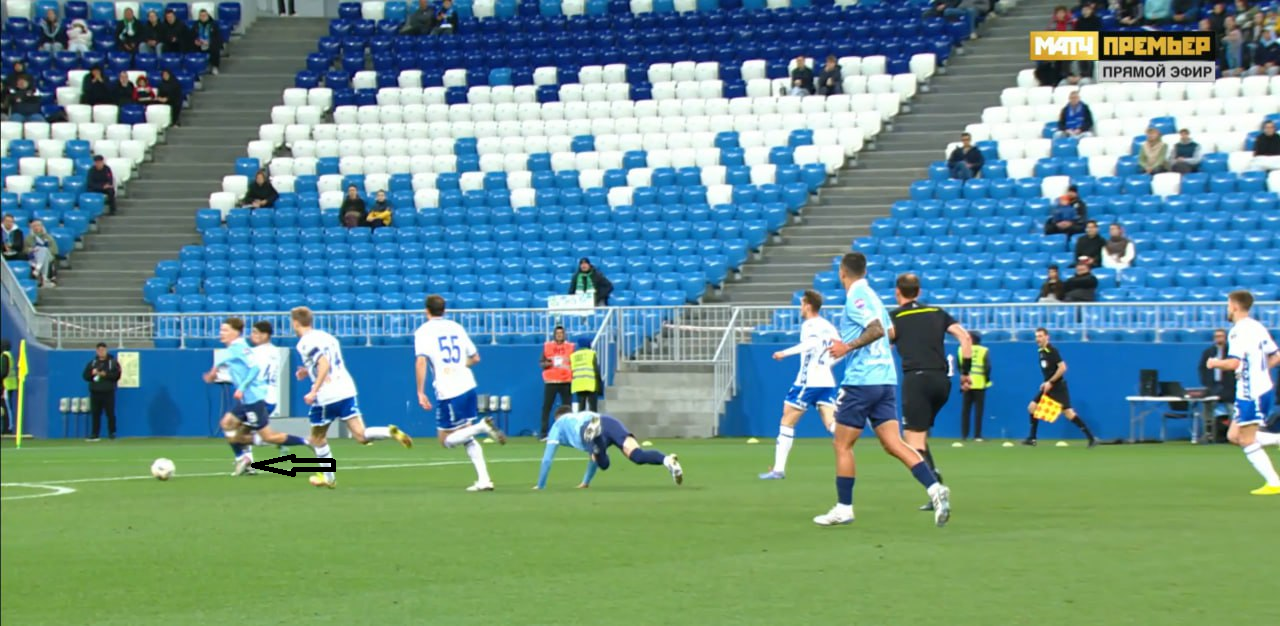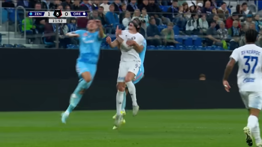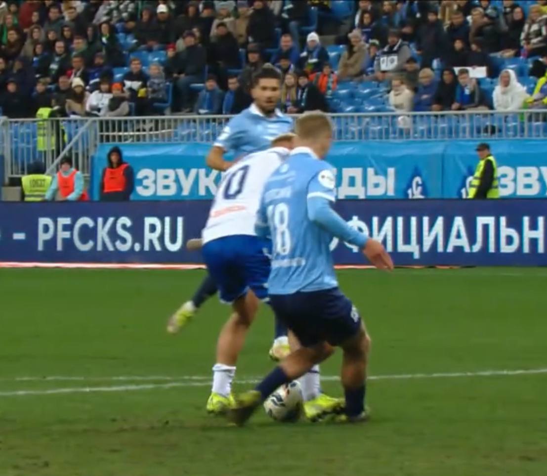 Проходивший на полчаса позже матч, прозванный в народе «эль газико» (хочу заметить - это название предложено еще в 2019 г. и совсем не «московскими недоброжелателями»), завершал субботу вывеской Зенит - Оренбург. Вылетевший по спортивному принципу из РПЛ клуб Газпром - добычи в этой игре исполнял роль, которая для него собственно и уготована - не мешать СБГ набирать очки. И игра, которая вообще не заслуживала бы разбора из-за отсутствия спортивной борьбы, дала повод тем не менее упомянуть об «ошибке» Танашева при первом голе Зенита. В начале голевой атаки был вот такой фол на Савельеве от Алипа, державшего форварда 2 руками