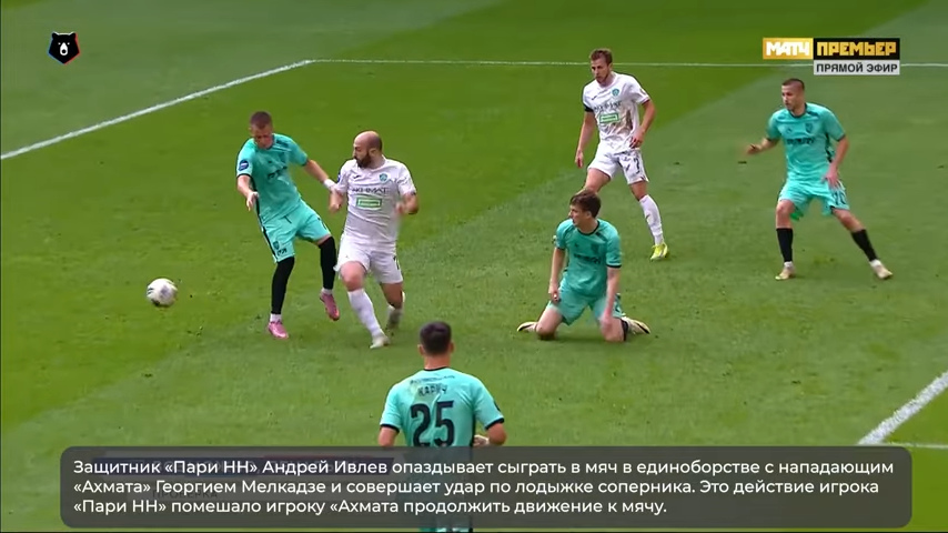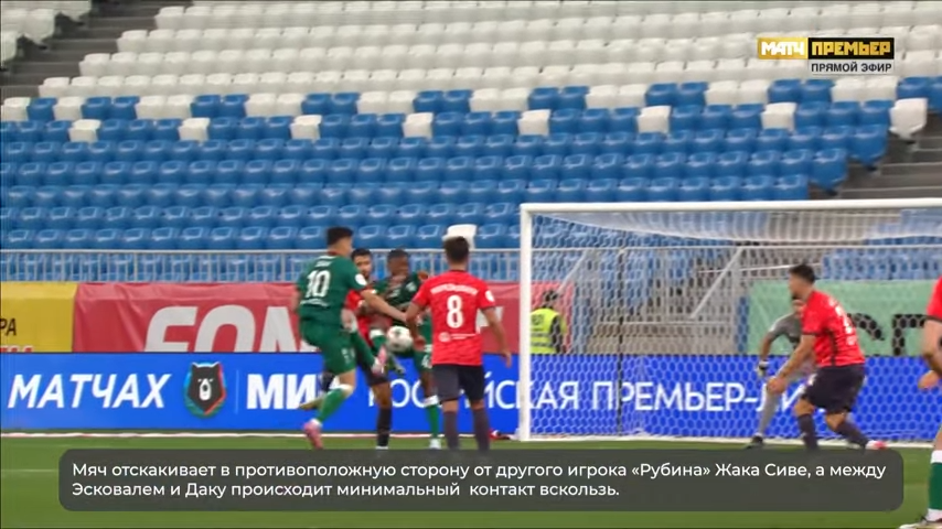 где пенальти не назначен. И здесь с мнением ЭСК можно согласиться, в отличие от случая со вторым пенальти в игре Пари НН - Ахмат, где Мелкадзе явно симулировал фол - покадрово момент есть тут. Нам же предложен такой скрин после контакта с выводом ЭСК