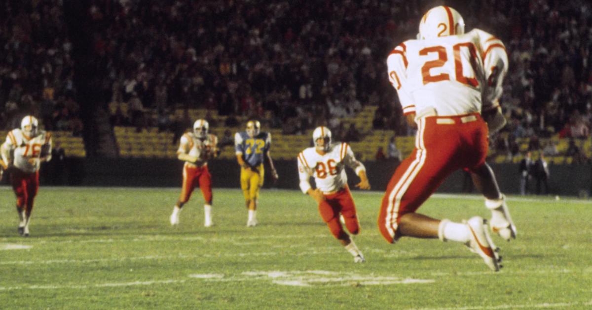 «Вот бьет [Джо] Уайли. Высоко. Летит хорошо», — говорит комментатор из Небраски Лайелл Бремсер. «Роджерс принимает мяч на 30 ярдах».