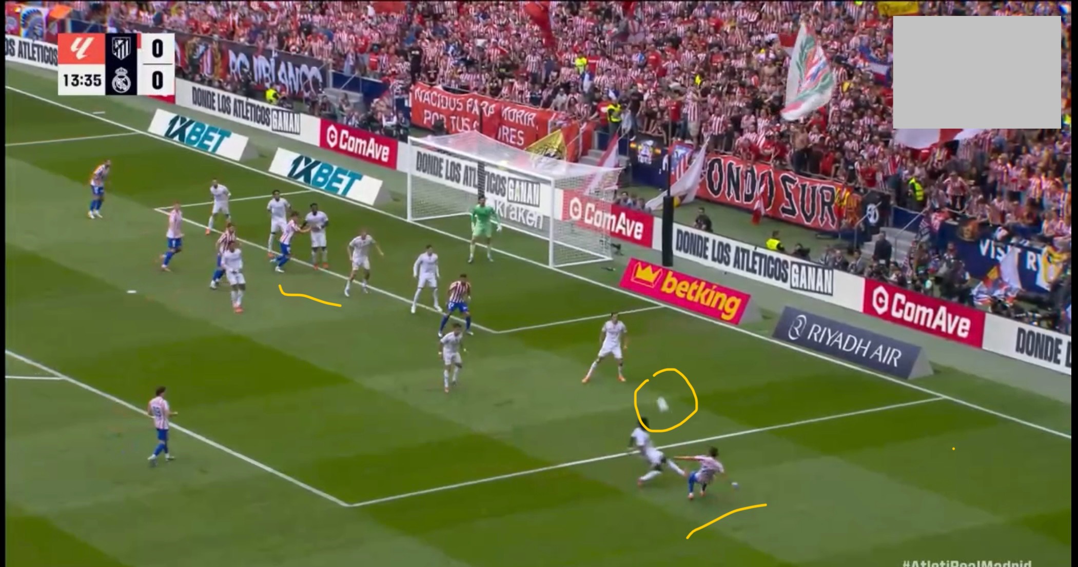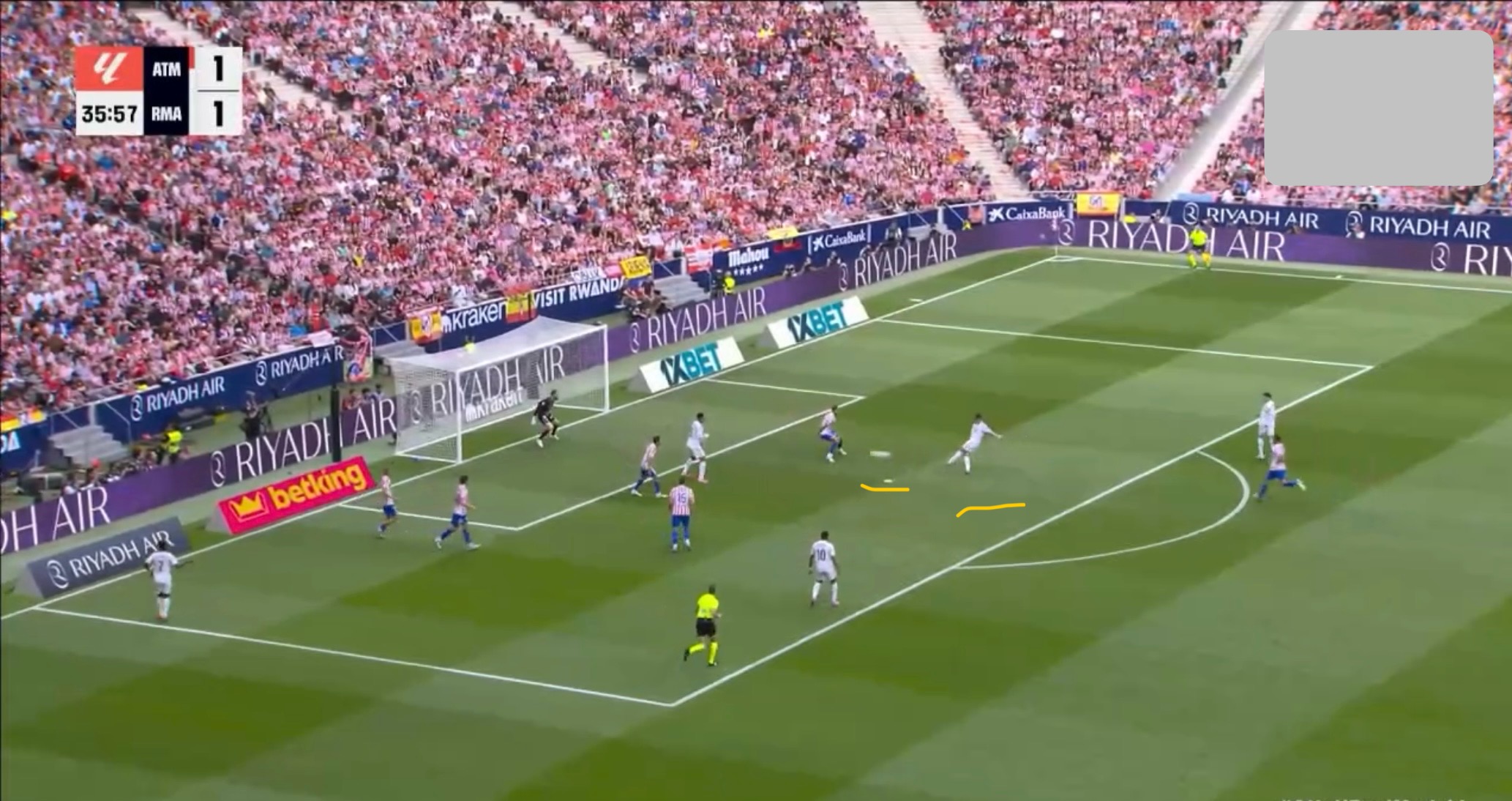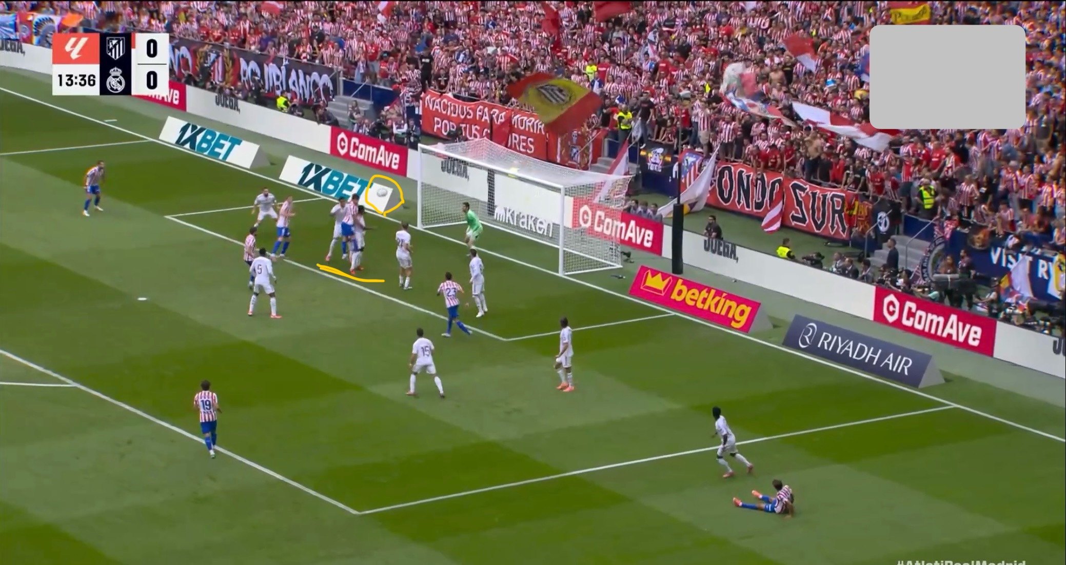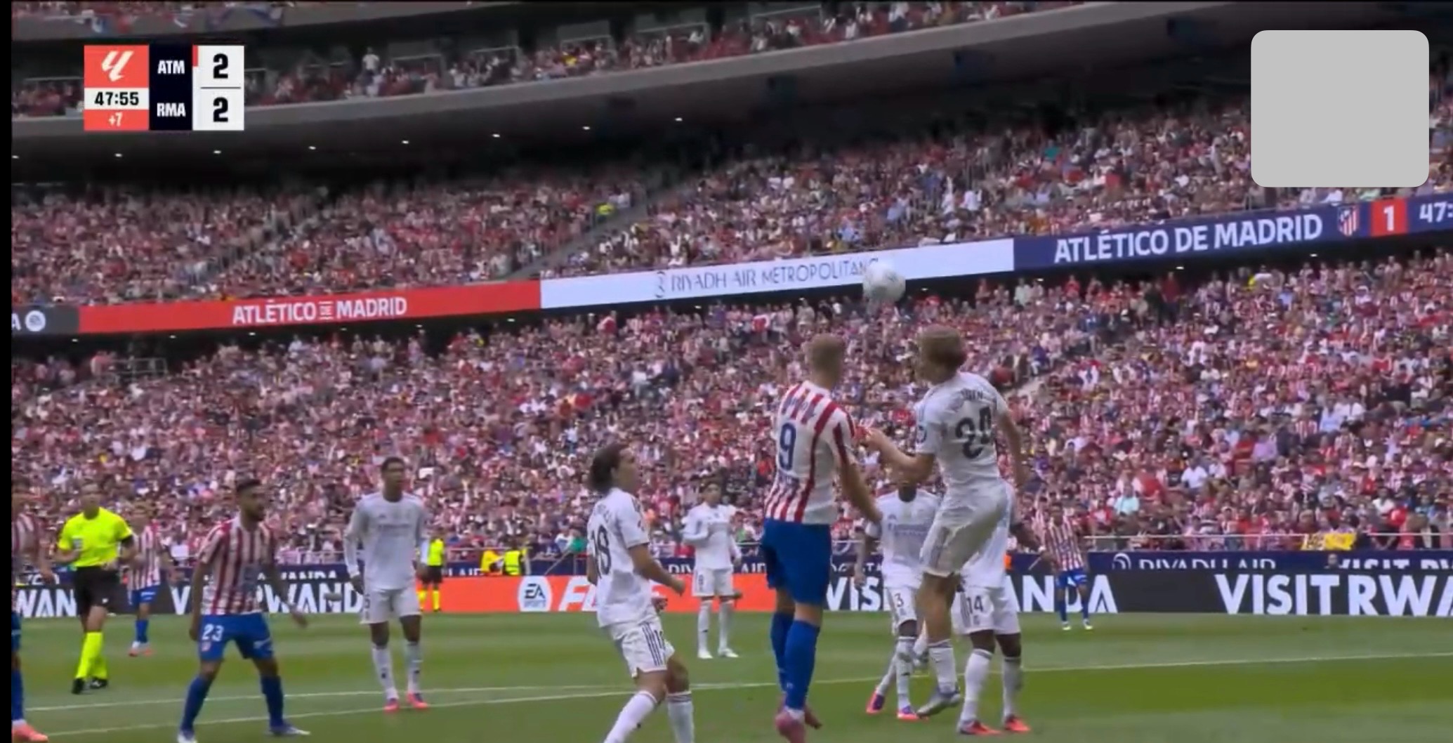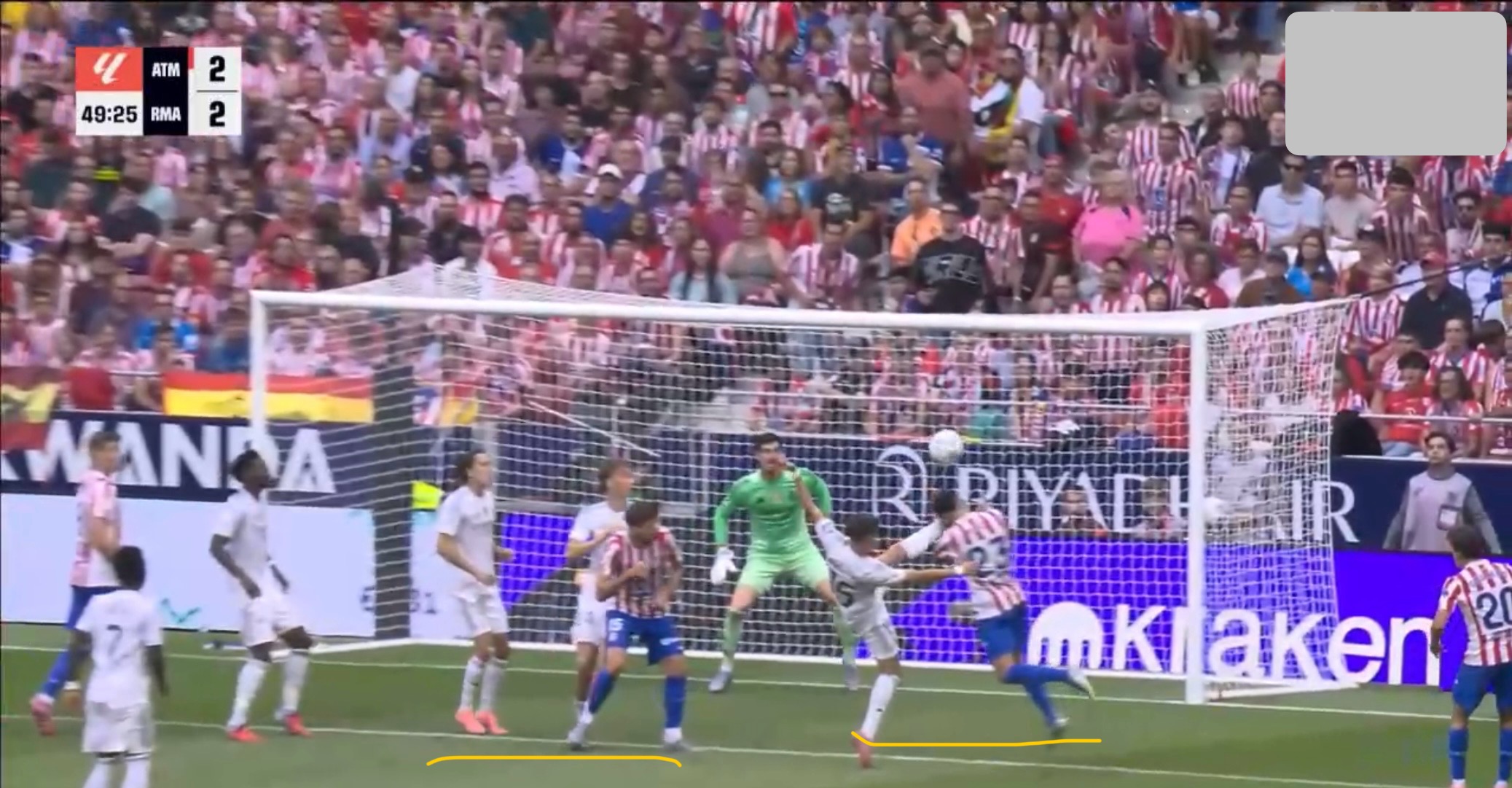 Вот так быстро «Реал Мадрид» вышел уже вперед. Эти два гола были забиты двумя ударами в створ. Тут могли многие задуматься, что «Реал» сейчас вообще закрыть все вопросы с победителем, но нет тут-то было. «Атлетико» хоть и пропустил два, еще и за 11 минут, все равно не стали отходить от своего плана. И вот 44 минута, хозяева подают угловой, Лангле остается в чужой штрафной совсем один и забивает гол. Но радость продлилась недолго, судья зафиксировал игру рукой у защитника «Атлетико». Все же, это снова был звонок защитникам «Реала», надо ответственней играть на втором этаже и не терять игроков в своей штрафной. 48 минута, заброс в штрафную в исполнении Коке, и Сорлот без какой либо проблемы забивает головой - 2:2. Подачу выполняли далеко от штрафной и в штрафной все было вроде бы пол контролем. Четыре защитника «Реала» и три игрока «Атлетико», двое из которых уже бегут в сторону своих ворот, но не Сорлот. Который забил этот гол, потому что Хейсен неправильно выбрал позицию и выпрыгнул раньше, чем следовало бы, а Каррерас понадеялся на своего партнера и просто остался в статичном положении.