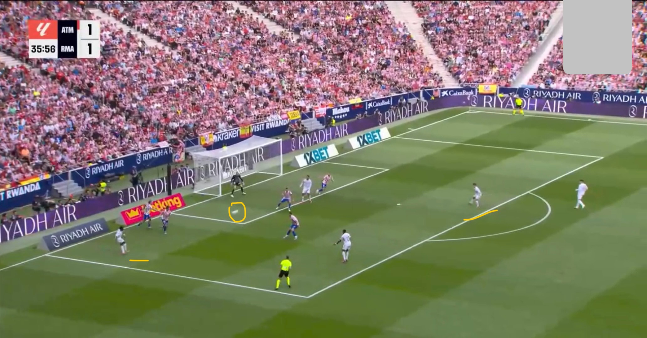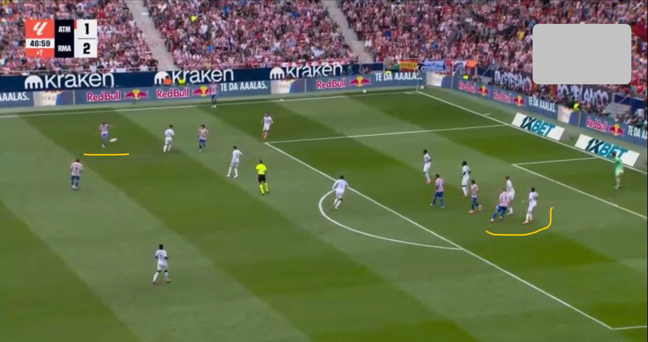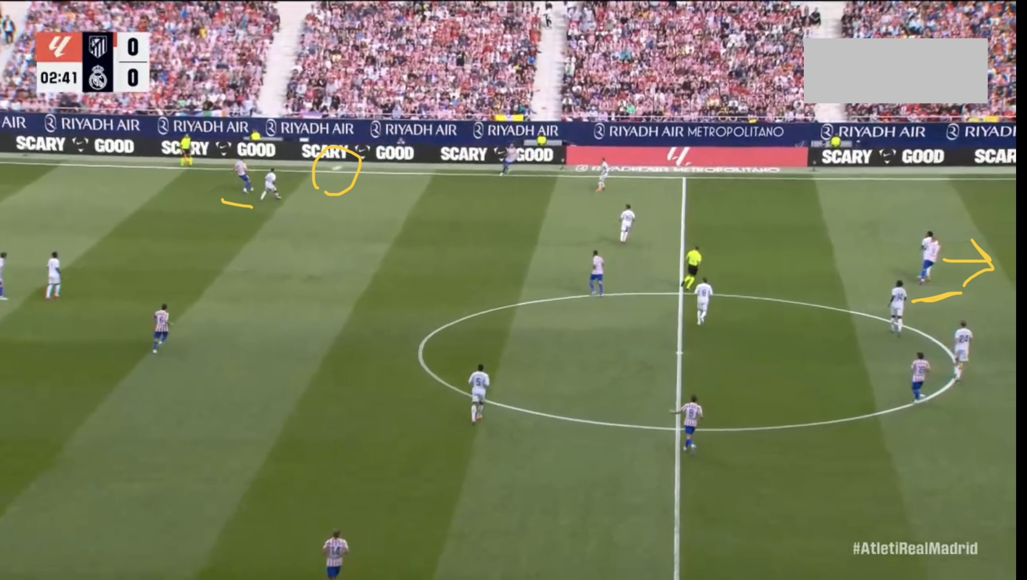С начала сезона всех удивляет прессинг «Реала Мадрида». До Хаби Алонсо болельщики «сливочных» такого не видели. А тут почти без предсезонки и сразу так хорошо. «Реал» давил своим прессингом все команды, с которыми встречались в этом сезоне, особенно это было заметно матче «лиги чемпионов» с «Марселем». Игроки мадрида накрывали своих соперников из франции сразу же после розыгрыша мяча от ворот. Получалось у них это превосходно. На 3.74 xG наиграл в том матче королевский клуб. А вратарь «Марселя» в том матче совершил 13 сейвов. Так вот, «Атлетико» тоже любит разыгрывать низом и короткими передачами, но именно выход Сорлота повлиял на план игры. «Атлетико» с первых же минут выходил без труда со своей половины поля за счет длинных передач в сторону Сорлота. Александр прекрасно за них цеплялся и развивал атаку своей команды. За первый тайм хозяева сделали 27 попыток длинных передач из них 12 были точны.