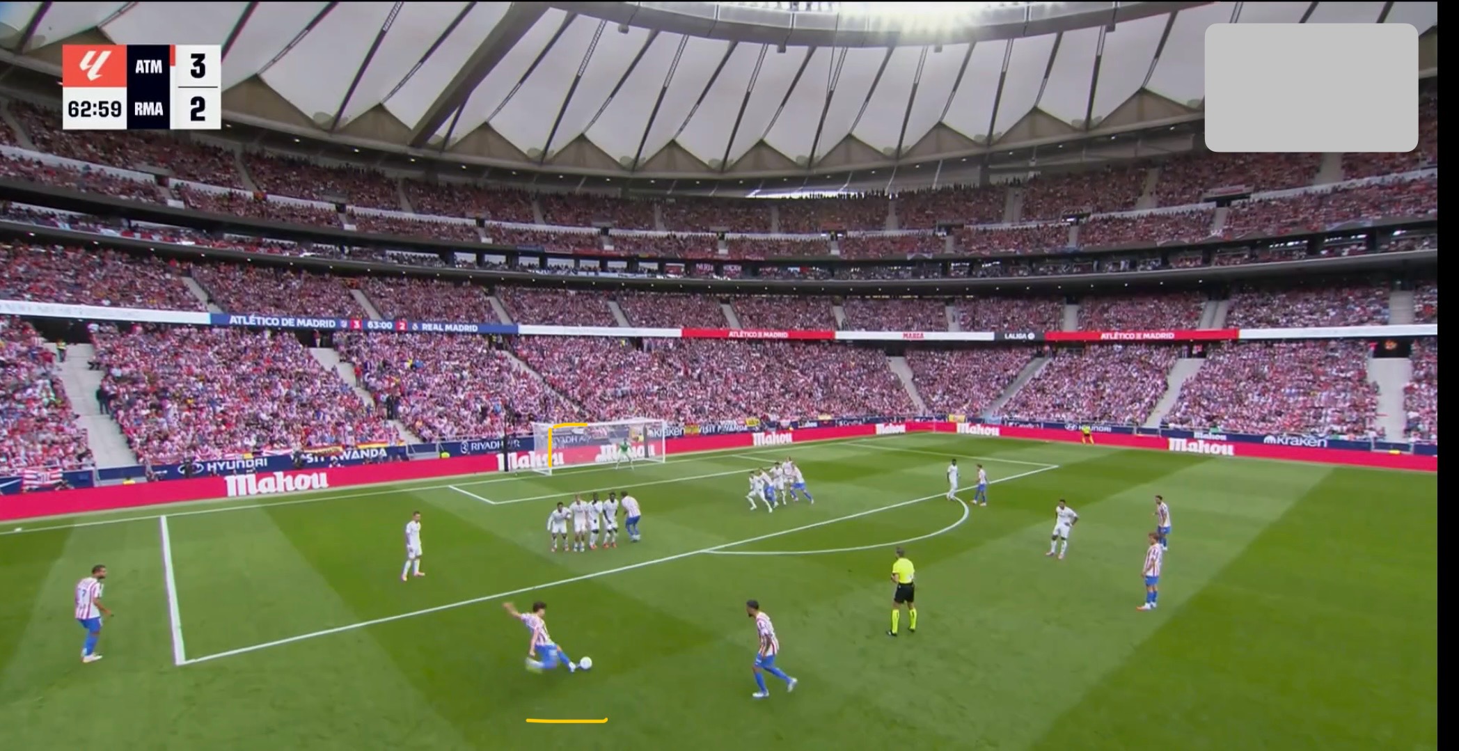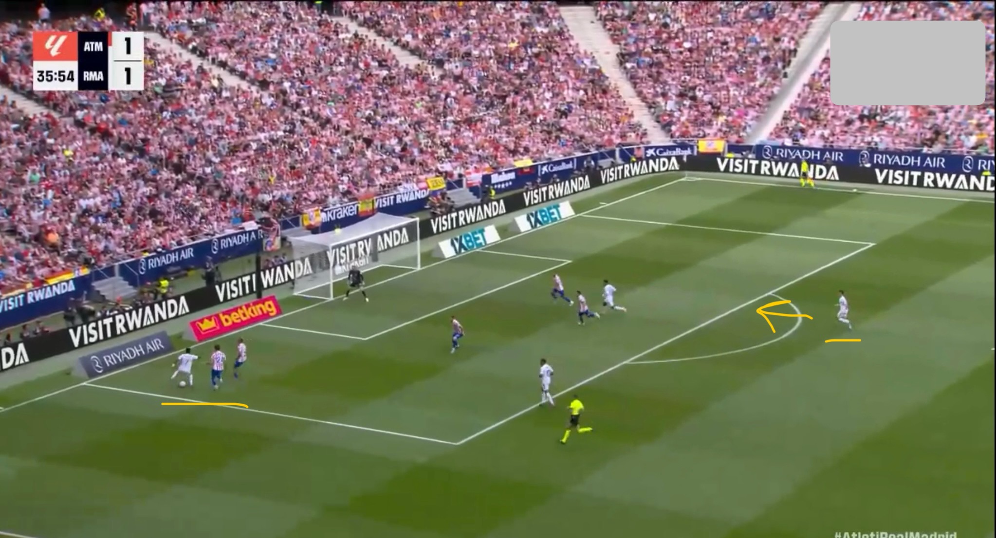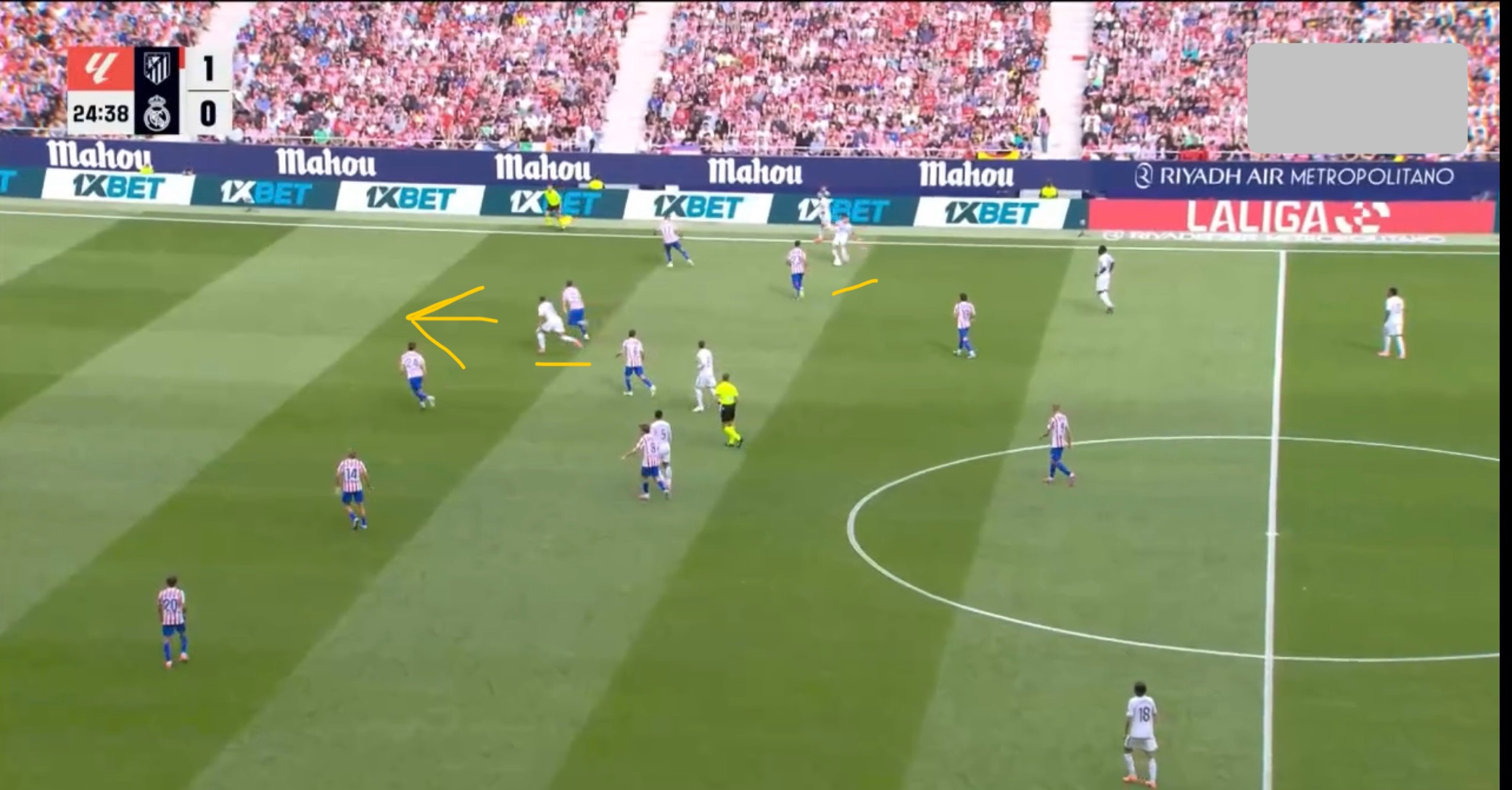С начала сезона всех удивляет прессинг «Реала Мадрида». До Хаби Алонсо болельщики «сливочных» такого не видели. А тут почти без предсезонки и сразу так хорошо. «Реал» давил своим прессингом все команды, с которыми встречались в этом сезоне, особенно это было заметно матче «лиги чемпионов» с «Марселем». Игроки мадрида накрывали своих соперников из франции сразу же после розыгрыша мяча от ворот. Получалось у них это превосходно. На 3.74 xG наиграл в том матче королевский клуб. А вратарь «Марселя» в том матче совершил 13 сейвов. Так вот, «Атлетико» тоже любит разыгрывать низом и короткими передачами, но именно выход Сорлота повлиял на план игры. «Атлетико» с первых же минут выходил без труда со своей половины поля за счет длинных передач в сторону Сорлота. Александр прекрасно за них цеплялся и развивал атаку своей команды. За первый тайм хозяева сделали 27 попыток длинных передач из них 12 были точны.
