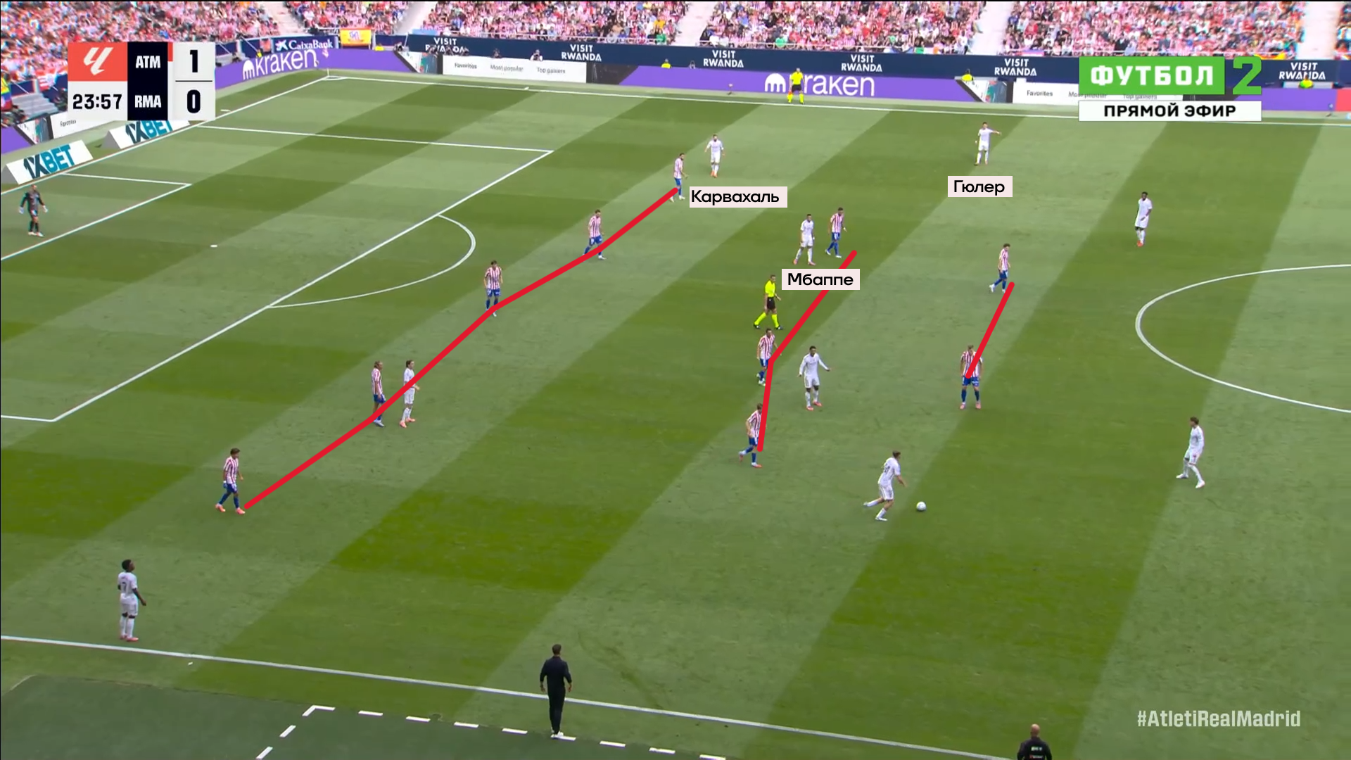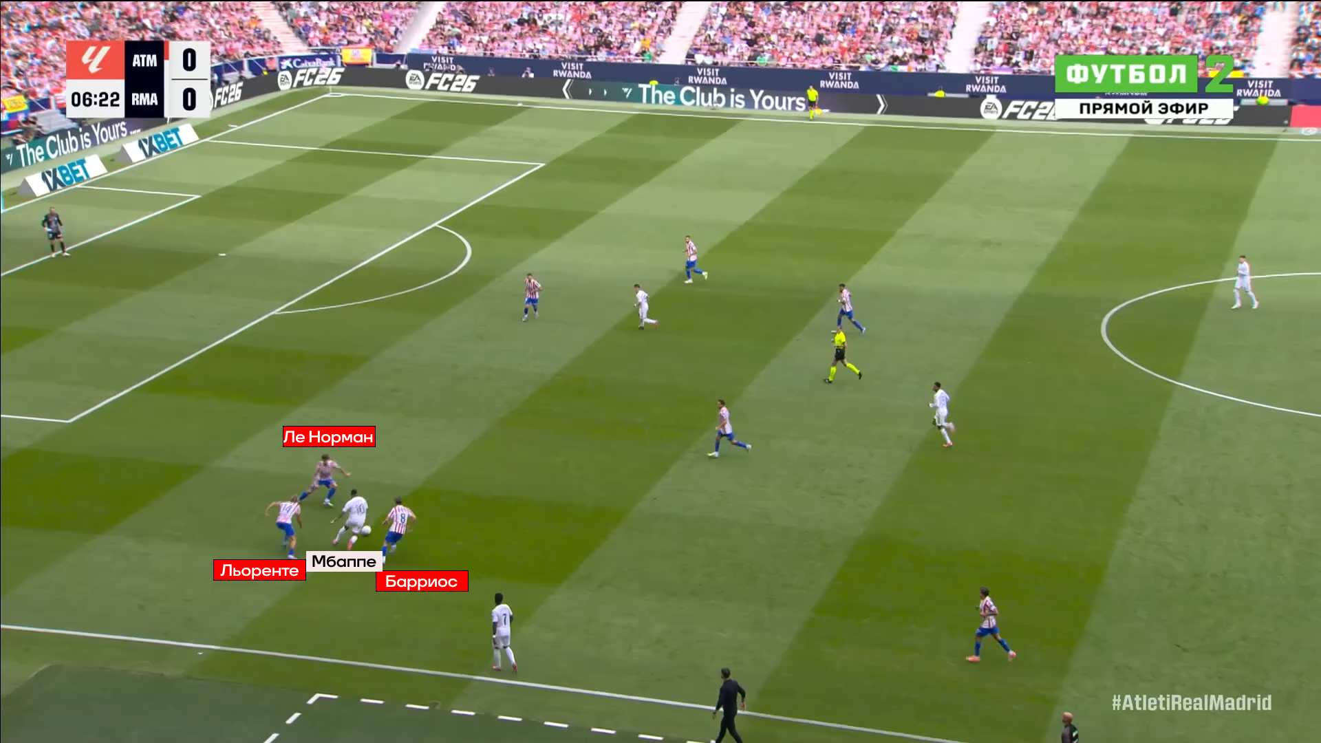 Важно понимать, что оба гола «Реала» не вытекали из логики игры. Оборона «Атлетико», за исключением вышеупомянутых ошибок Ле Нормана, держалась идеально.