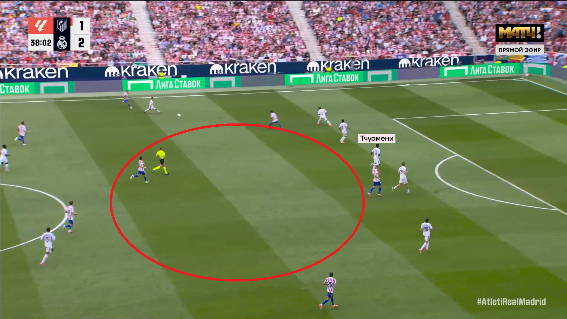 Смысл идеи, опять же, понятен — сдержать персонально Серлота (Тчуамени играет по нему персонально) и верховые передачи «Атлетико» в общем.