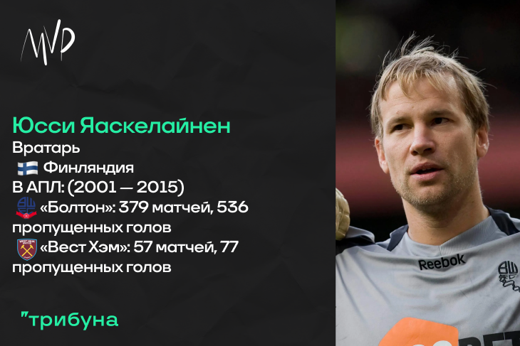 Юсси Яаскелайнен – один из символов английского футбола нулевых годов. Финский голкипер, между прочим, входит в топ-10 по числу проведенных матчей в Премьер Лиге среди легионеров и, как уже писалось выше, является рекордсменом «Болтона» среди всех игроков за все время. Кроме того, в сезоне-2001/02 Юсси был признан лучшим вратарем Чемпионата. Почему же еще именно Яаскелайнен? Пожалуй, из-за экзотичности своего гражданства. Действительно, футболисты из Финляндии редко становятся звездами европейского футбола (конечно, были и Сами Хююпия, и Микаэл Форссель), а тут столь колоритный персонаж – светлый волосы, борода, суровый взгляд. Яаскелайнен всегда был похож на викинга. Ну и ассоциация «Болтона», очень симпатичной команды, с этим футболистом, конечно, очень сильна. Хороший вратарь и очень интересный персонаж, преданный одному клубу.