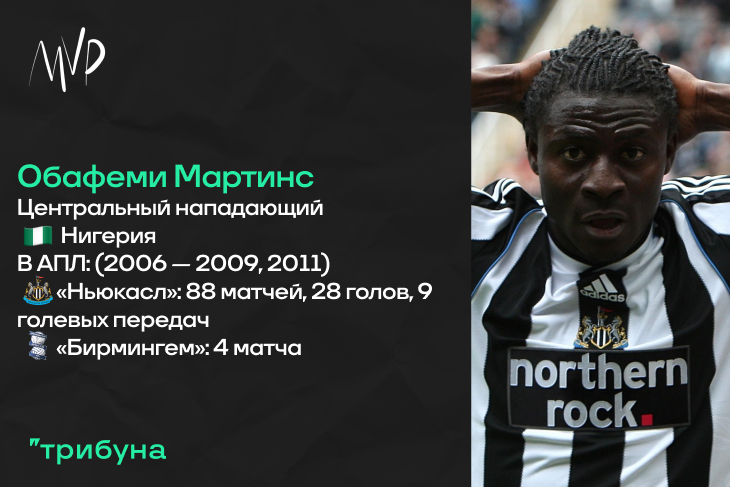 Ох, сейчас у вас действительно будет сводить «олдскулы». Нигериец Обафеми Мартинс очень ярко начал карьеру в составе миланского «Интера», с которым даже стал Чемпионом Италии. Там он часто выходил на замену и своими рывками взрывал головы защитникам. Впрочем, после прихода в клуб Креспо и Златана молодой африканец команду покинул – в «Ньюкасле», заплатившим летом 2006 года за него 16.00 миллионов Евро, он сразу же стал основным. Первый успех в команде Гленна Редера случился уже в третьем туре дебютного сезона, когда Мартинс отличился голом и голевым пасом в победной встрече с «Вест Хэмом». Затем была голевая засуха, завершившаяся в декабре – Обафеми своими результативными действиями принес «сорокам» победы против «Блэкберна», «Уотфорда» и сразу два раза против «Тоттенхэма». Итог первого сезона в Англии – одиннадцать голов и четыре голевые передачи.