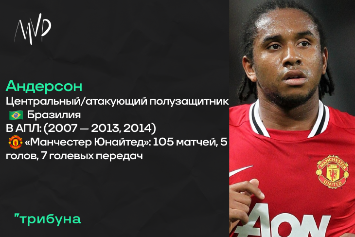 Включение Андерсона в нашу подборку объяснять, думаю, не нужно. Но я, конечно, это сделаю. В конце нулевых годов бразилец считался невероятно перспективным, он переходил в «Манчестер Юнайтед», сильнейший клуб Англии, за огромную для тех лет сумму и сходу закрепился в основе – на тот момент полузащитнику не было и двадцати лет. Дальше была премия лучшему молодому игроку мира, выигранные трофеи и… забвение. Конфликт с Фергюсоном, сорвавшийся переход в «Лион», травмы, лишний вес, еще травмы и перевод во второй состав «Юнайтед». Вышло так, что полузащитник, отличавшийся отличной техникой и пасом, а также дредами, уже в двадцать три года выпал из стартового состав «красных дьяволов». Можно сказать, что Андерсон – игрок-вспышка. Еще один нереализованный огромный талант из Южной Америки. Отдельной строкой отмечу то, что больше, чем футбол, полузащитник любил «Макдональдс» – одну из главных причин своих проблем с лишним весом и формой.