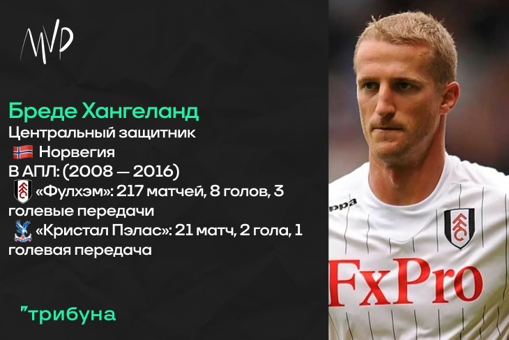 Почему Бреде Хангеланд? Отчасти потому, что одна из самых запоминающихся фигур очень симпатичного «Фулхэма» – высокий, с ярко выраженными лидерскими качествами, очень фактурный игрок. Он был очень хорош в защите, хотя именно на его совести гол Диего Форлана в том самом финале Лиги Европы в дополнительном времени. Но ассоциация Хангеланд с выражением «хороший защитник» была в то время, да и иногда проскакивает в наши дни. А еще Бреде, вопреки всем стереотипам, согласно которым все футболисты не блещут интеллектом, много читал, обожал вести диалоги на философским темы и старался всячески саморазвиваться. Хороший, но не звездный и не яркий футболист. Еще один классический защитник в английском футболе той, уже ушедшей эпохи.
