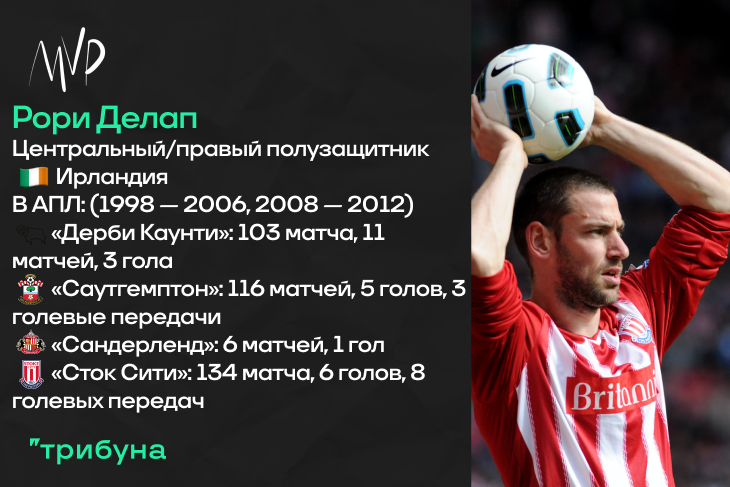 Но отмечался Рори Делап кое-чем другим. Вы, конечно, прекрасно понимаете о чем я. Ауты, вбрасываемые игроком «Сток Сити», до сих пор считаются одними из главных хайлайтов английского футбола конца нулевых годов. Дело все в том, что ирландец в юном возрасте занимался легкой атлетикой, где специализировался на метании копья. Собственно, именно поэтому он и умел запускать мяч руками на тридцать, а то и больше, метров. Тони Пьюлис, чей «Сток» играл в довольно топорный футбол, активно использовал это преимущество – ауты «гончаров» больше напоминали угловые, а центральные защитники всякий раз ходили в чужую штрафную для верховой борьбы. Некоторые соперники команды Делапа даже сдвигали рекламные баннеры ближе к разметке поле, дабы сократить зону для разбега Рори при вбрасываниях. Что же до игровых характеристик ирландца – это был неплохой, но далеко нетоповый полузащитник, без больших навыков, но и приносящий командам немало пользы своими действиями на поле. А еще сейчас сын Делапа, Лиам, защищает цвета лондонского «Челси».
