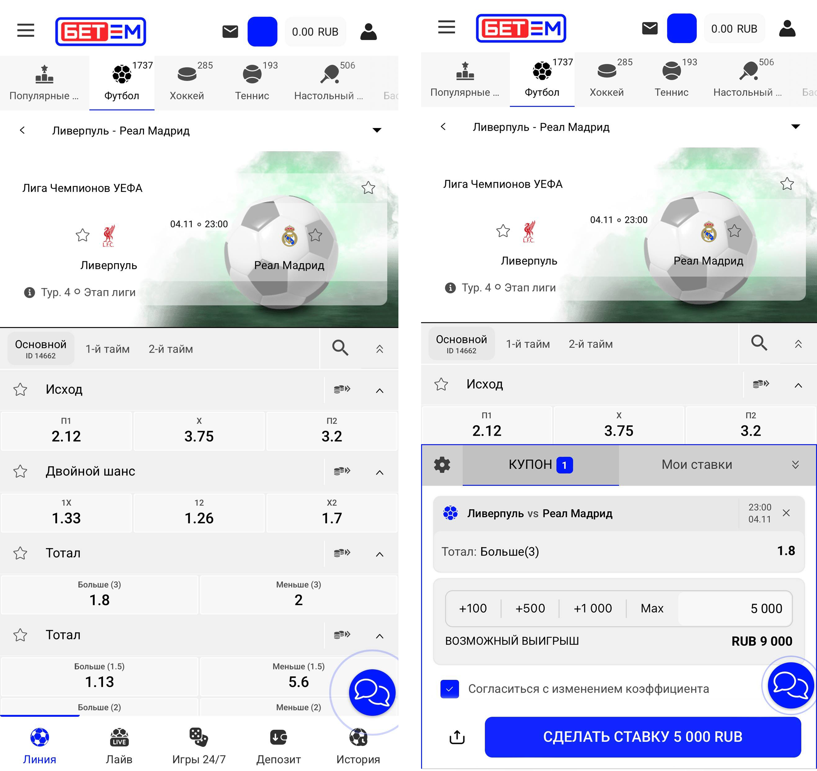 - Нет, после размещения ставки в БК «Бет-М» отменить ее нельзя. Поэтому всегда внимательно проверяйте ваши выборы перед подтверждением ставки.