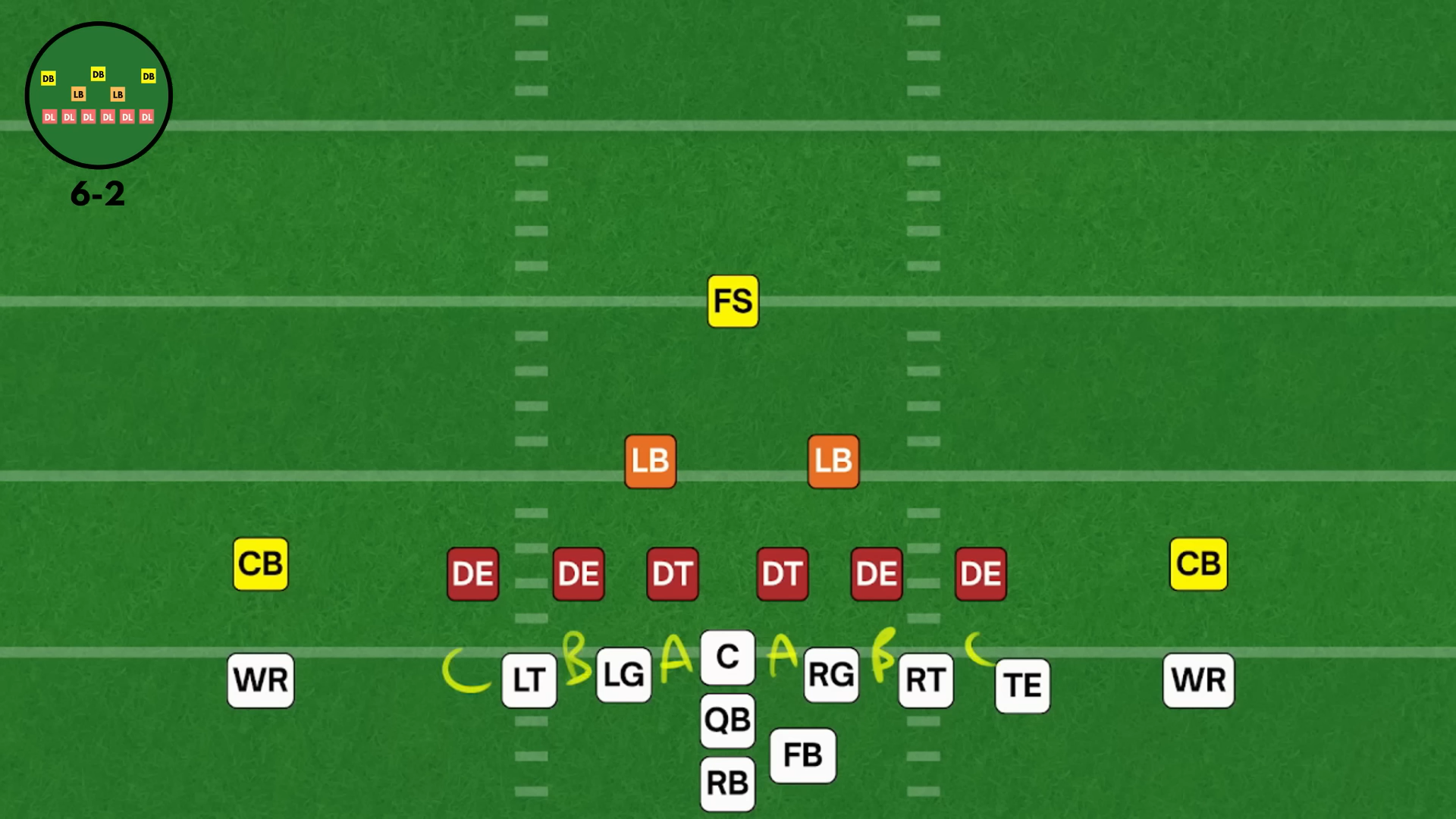 6-2 формация — это самая радикальная версия защиты против выноса. Шесть линейных обеспечивают контроль, закрывая все проходы между линейными нападения. Это так называемые проходы A между центровым и гардами, проходы B между гардами и тэклами, проходы C по внешней стороне тэклов.