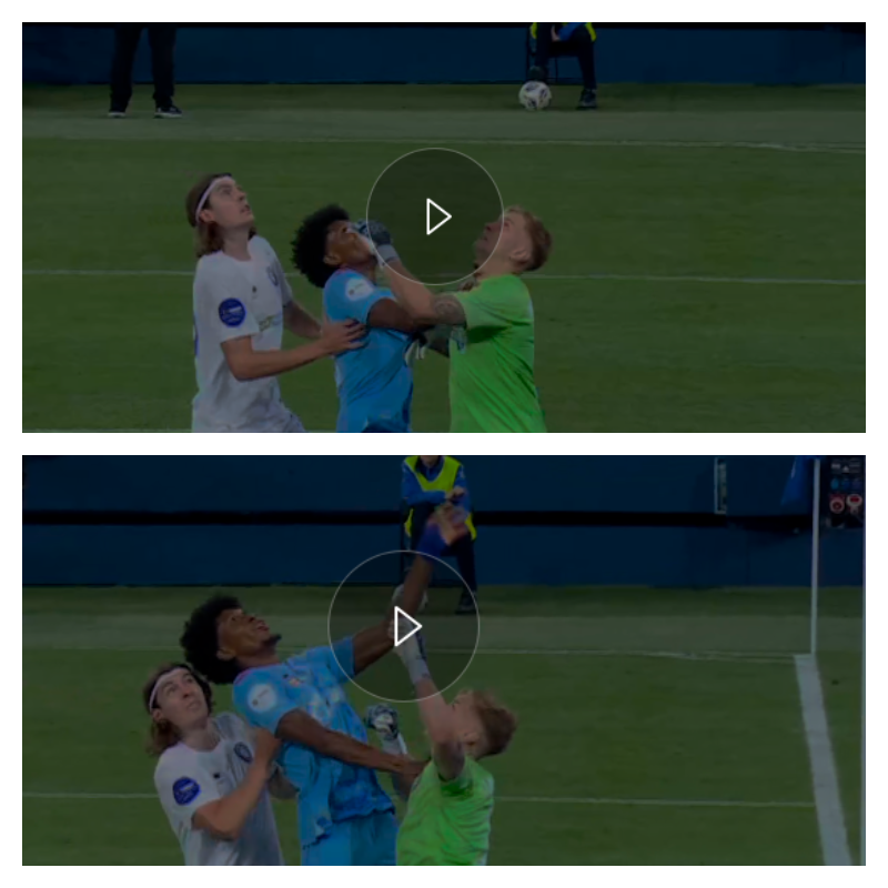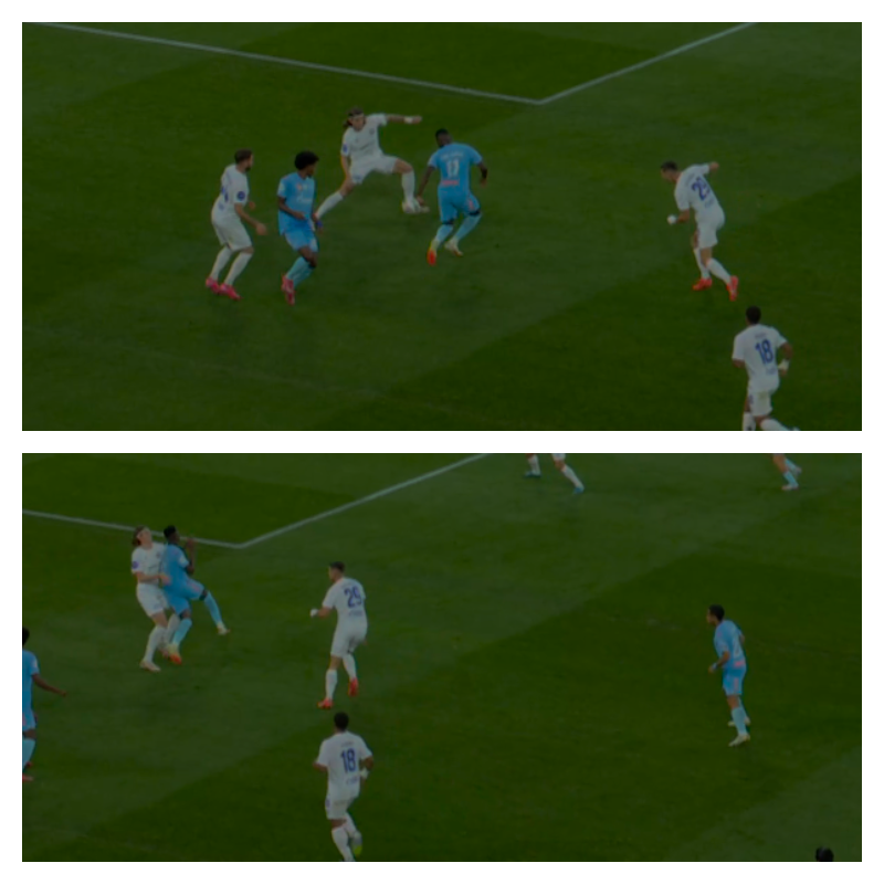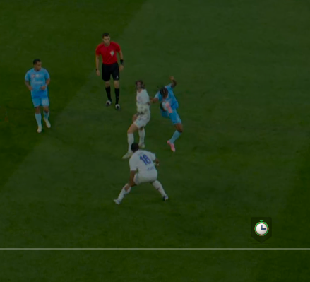 22 минута.. Эпизод непосредственно перед голом. Нино успевает первым сыграть в мяч, но Алип всё - таки откровенно прихватывает Савельева. Возможно, арбитру показалось, что захват не был настолько силён , чтобы иметь влияние на эпизод и Нино всё - равно был бы на мяче первым, а кроме того..