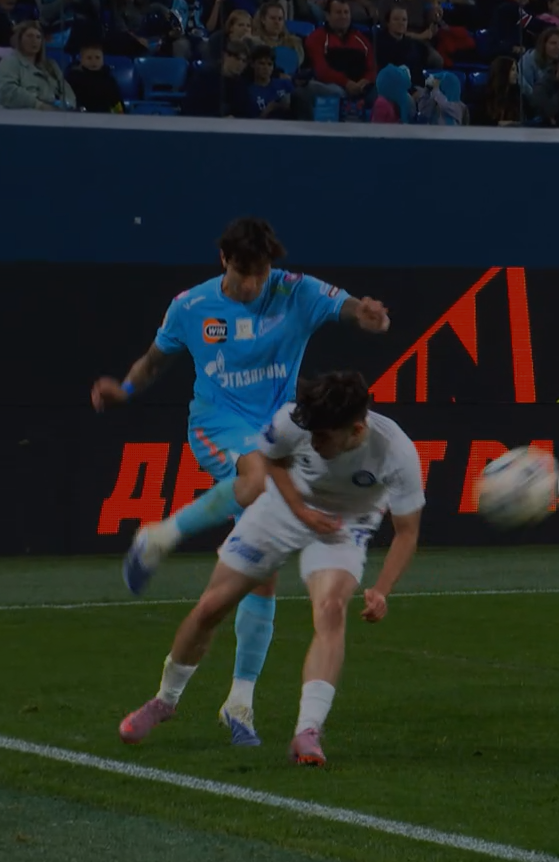 19 минута. Фол в атаке свистит арбитр при подаче Зенитом углового. Честно, не знаю, что тут Танашев разглядел, там и игроки Оренбурга не сразу поняли, что свисток в их пользу. Может показалось, что Алип подталкивал защитника в белой форме.