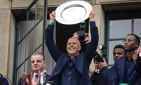 5. Арне Слот поднимает трофей чемпионата с балкона мэрии Роттердама.