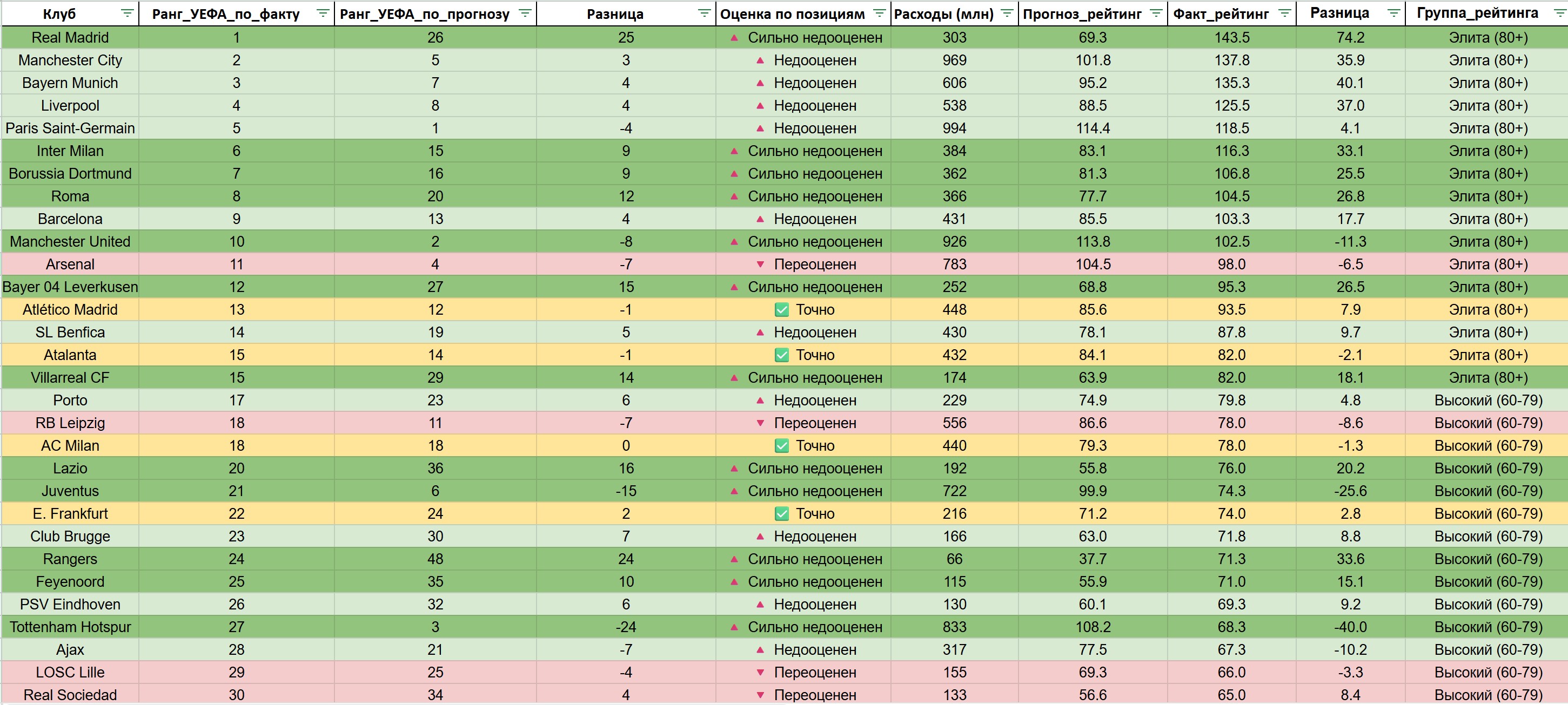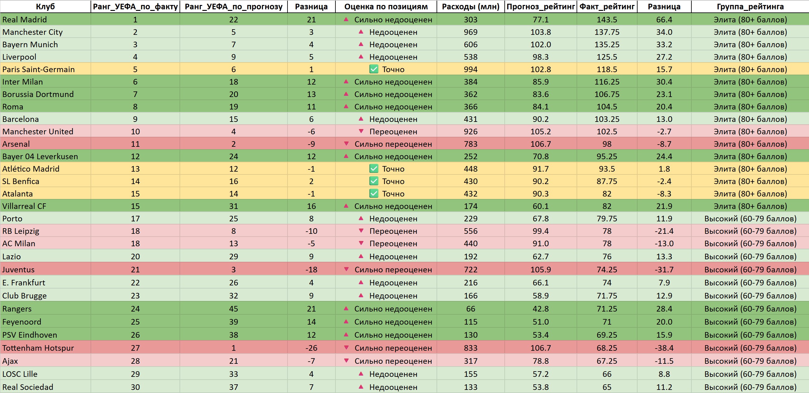 Самая негативная с точки зрения неэффективности инвестиций среди всех клубов с отрицательным трансферным балансом у «Тоттенхэма» (-26 позиций), «Марселя» (-22) и «Наполи» (-20). Самая лучшая разница с миром где все решают расходы у «Реала» (+21), «Ренджерс» (+21) и «Вильярреала» (+16). Клубы с соответствием расходов к результатам в еврокубках: «ПСЖ», «Атлетико Мадрид», «Бенфика» и «Аталанта». Их фактические позиции в рейтинге УЕФА почти идеально совпадают с прогнозом, основанным на расходах. При этом стоит отметить, что «ПСЖ» и «Атлетико» находятся в зоне высокой неэффективности, в то время как «Бенфика» и «Аталанта» демонстрируют отдачу от трансферов выше среднего.