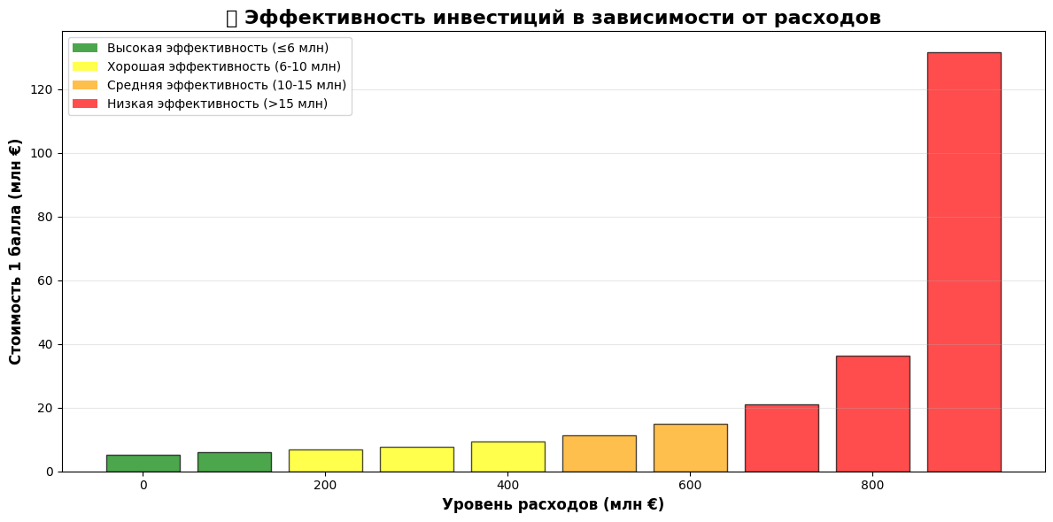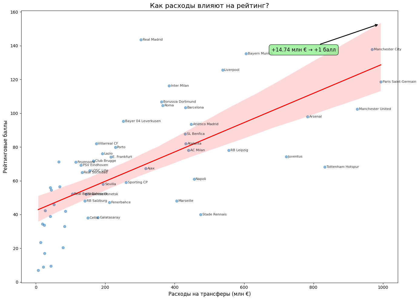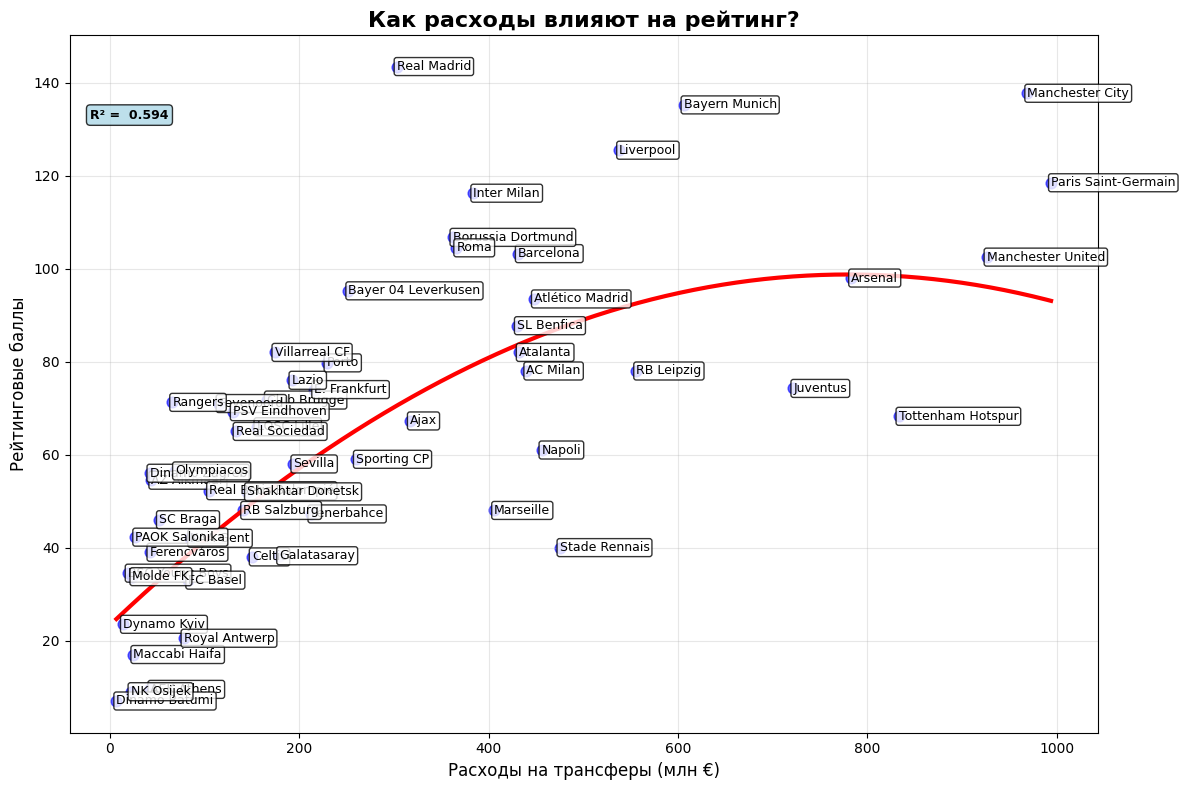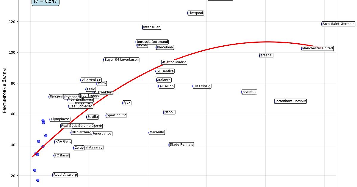30.94 – это базовый рейтинг, который в математической модели клуб получил бы при нулевых расходах и доходах. Модель считывает убывающую отдачу от инвестиций – дополнительные расходы дают все меньшую отдачу в виде рейтинговых очков.