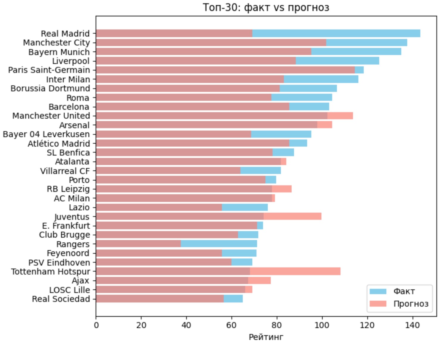 При сравнивании прогнозного рейтинга УЕФА с фактическим рейтингом максимально высоко поднимается «Реал Мадрид» – по прогнозу должен был занимать 22 место. В верху рейтинга самые большие значения рейтингов соответственно поэтому самые большие расхождения прогноза с фактом. Согласно модели Аякс мог бы претендовать на большее в рейтинге УЕФА, однако, мы тут не учитываем доходы (с ними модель становится менее надежной для всех клубов в среднем). В негативную сторону нужно отметить «Милан» – если бы трансферные расходы были со средним уровнем эффективности (при прочих равных), то занимали бы 13 место (+5 позиций).