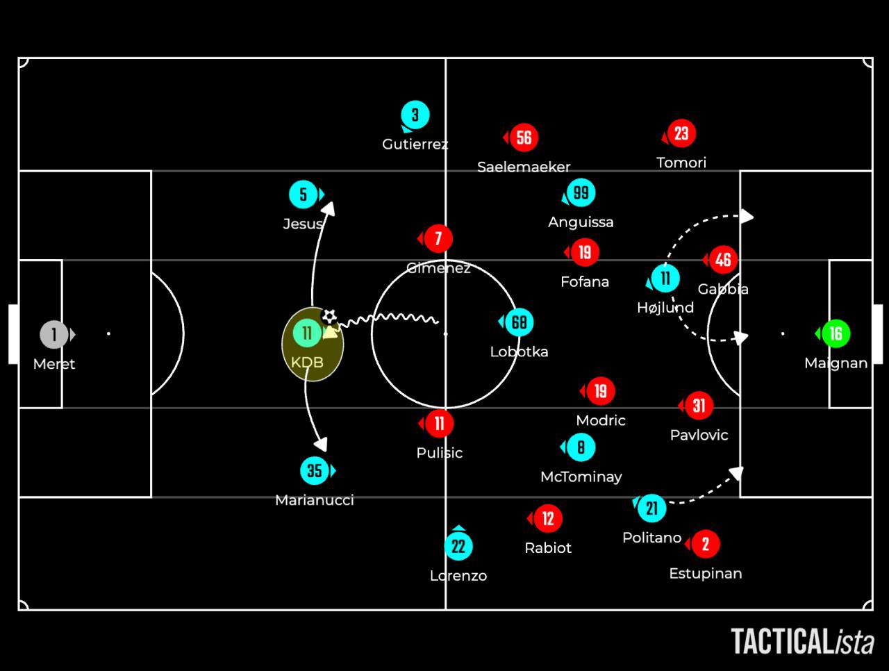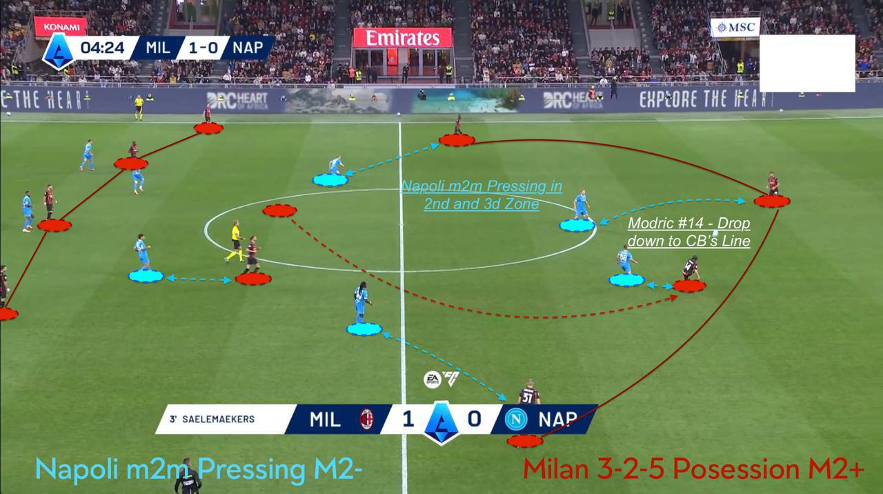 «Наполи» с первых минут показал как будет играть во владении: 4+1-4-1 — узкая схема с двумя ЦЗ и КДБ(или Лоботка) между ними, а Мактоминей и Ангисса выдвигались выше как инсайды.